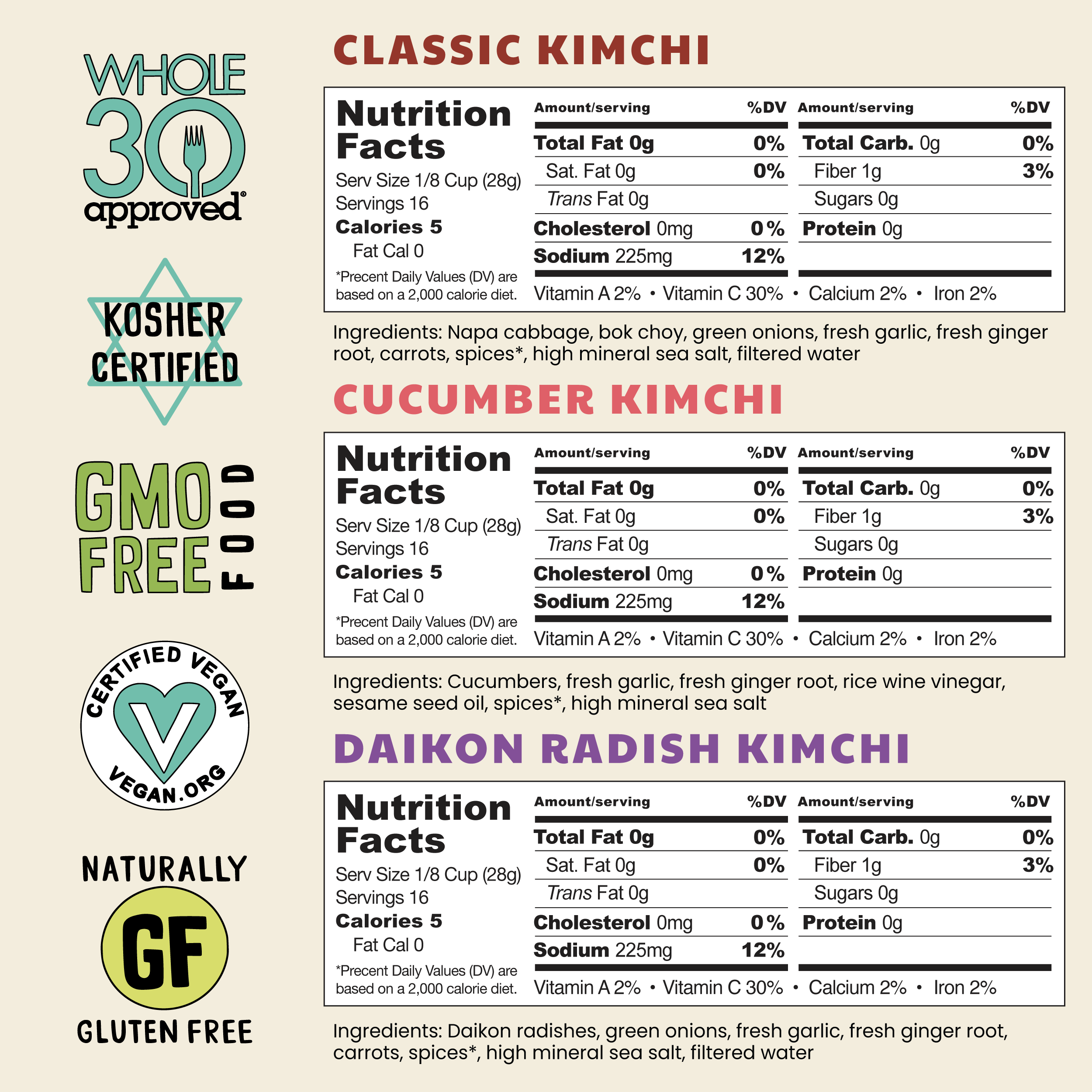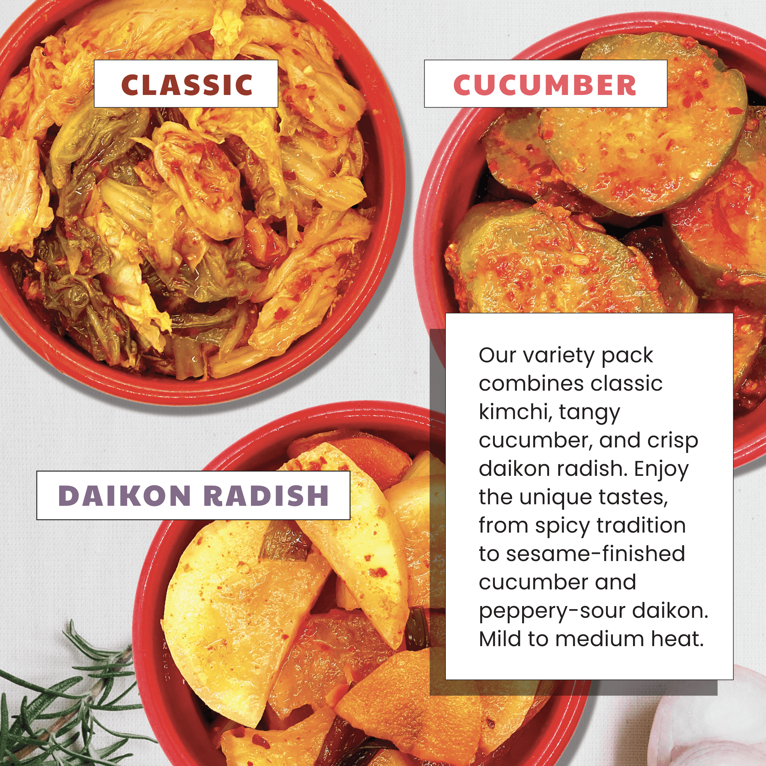 - Includes: (1) Daikon Radish Kimchi, (1) Classic Kimchi, and (1) Cucumber Kimchi