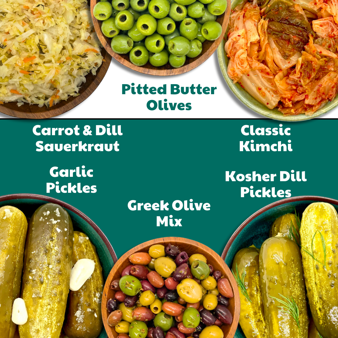 Get probiotic, naturally fermented olives in a variety of flavors. Green and black olives and everything in between, your gut and your taste buds will thank you.