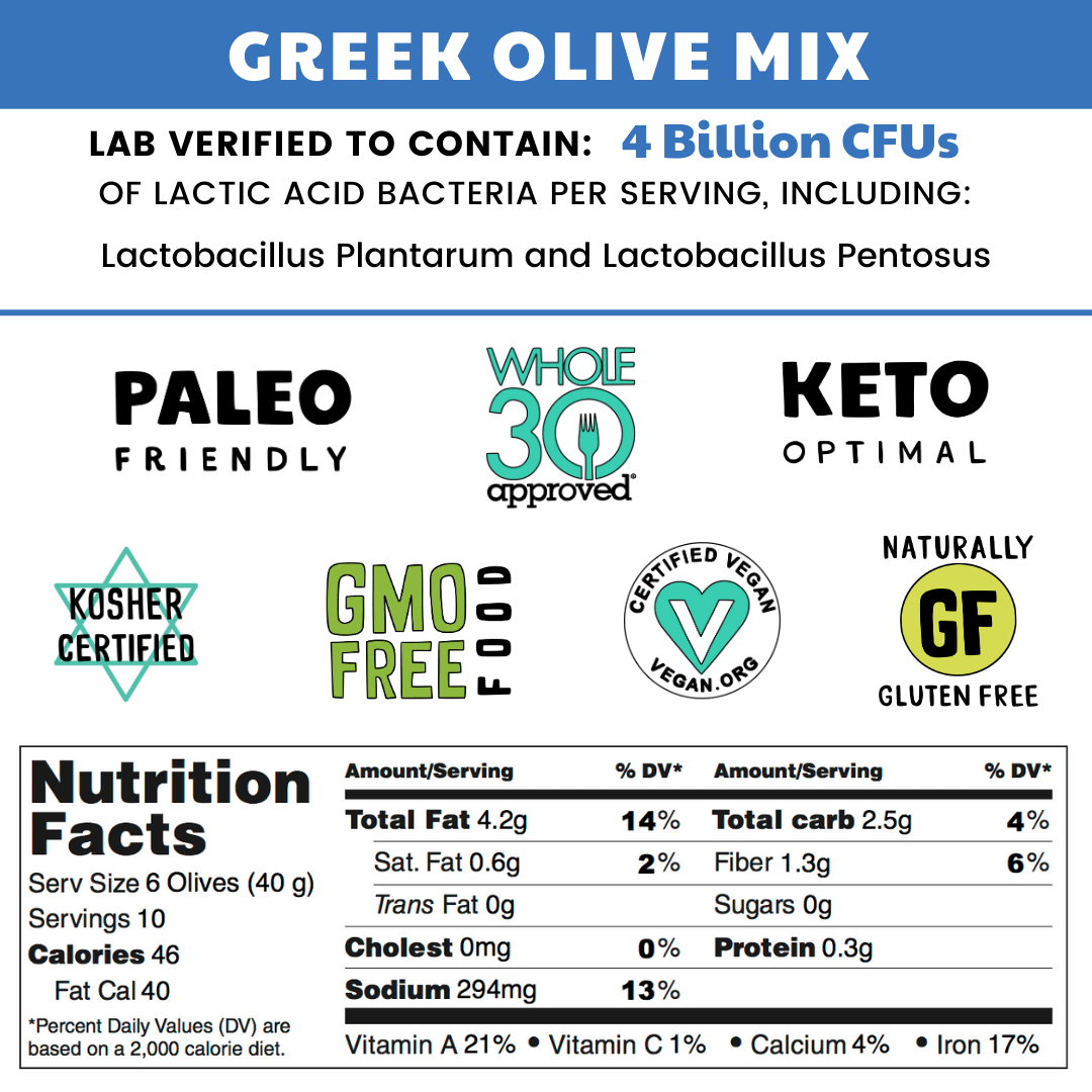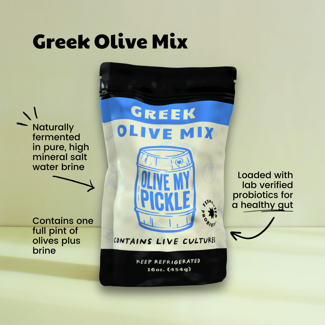 The Greek Mix is a delightful assortment of mild and robust probiotic olives, lightly seasoned with Mediterranean herbs. This mix is a family favorite, perfect for all ages. The best part? No pits!