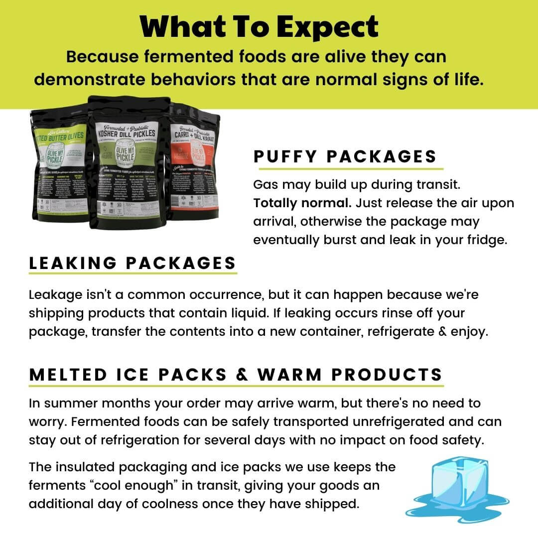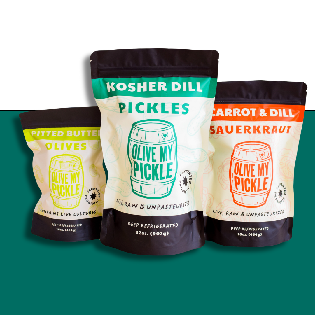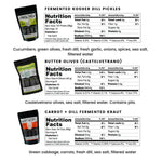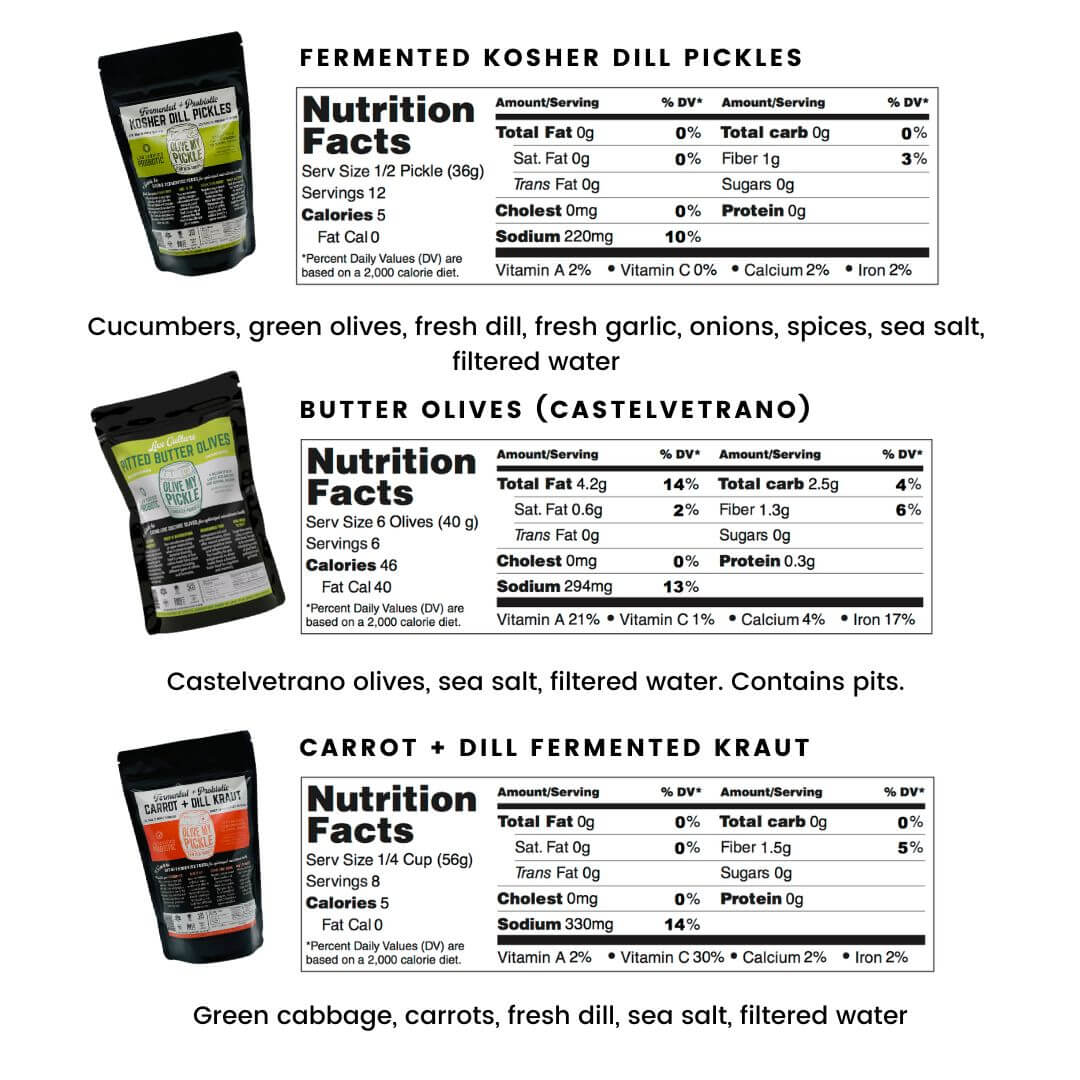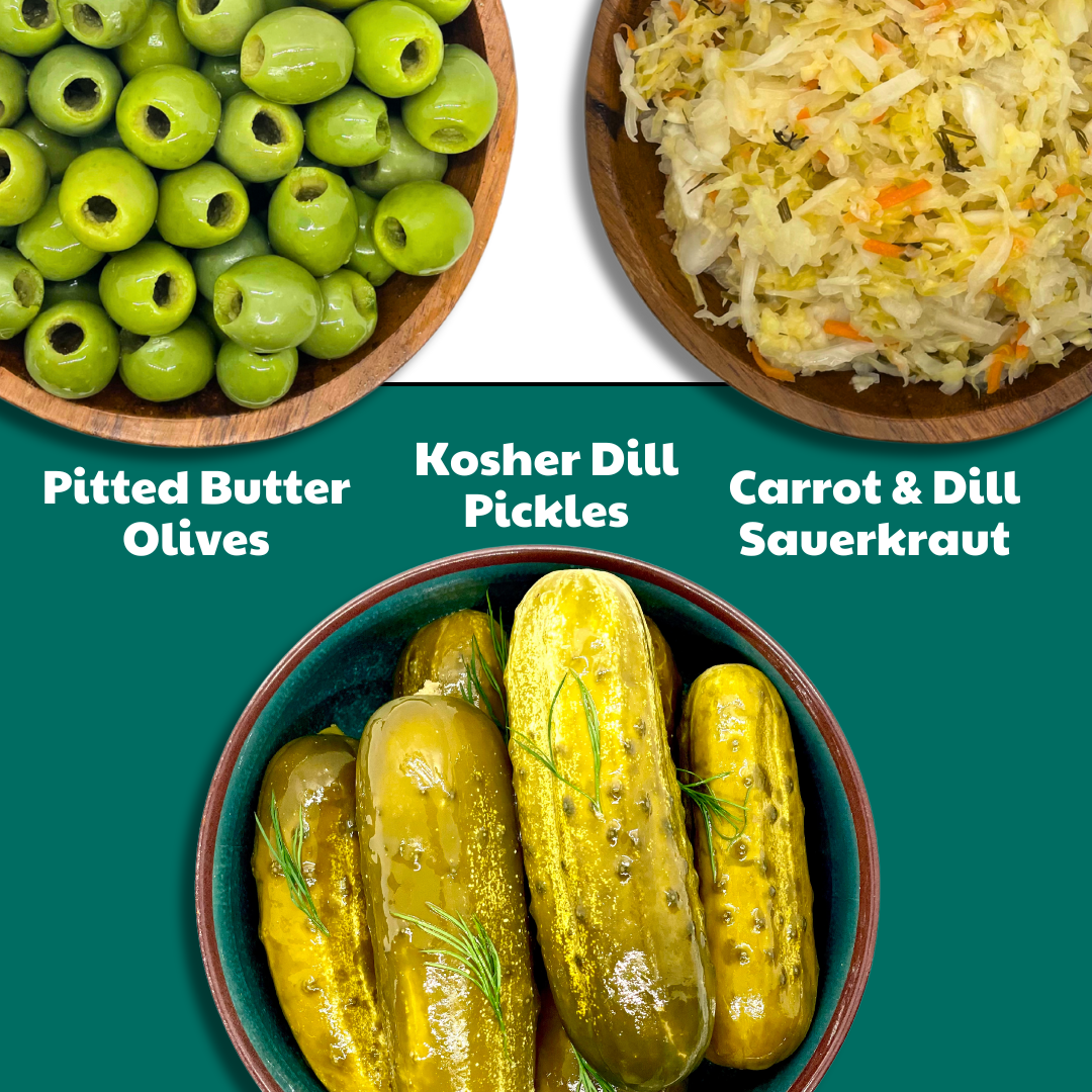 - Includes: (1) Pitted Butter Olives, (1) Kosher Dill Pickles, (1) Carrot + Dill Sauerkraut