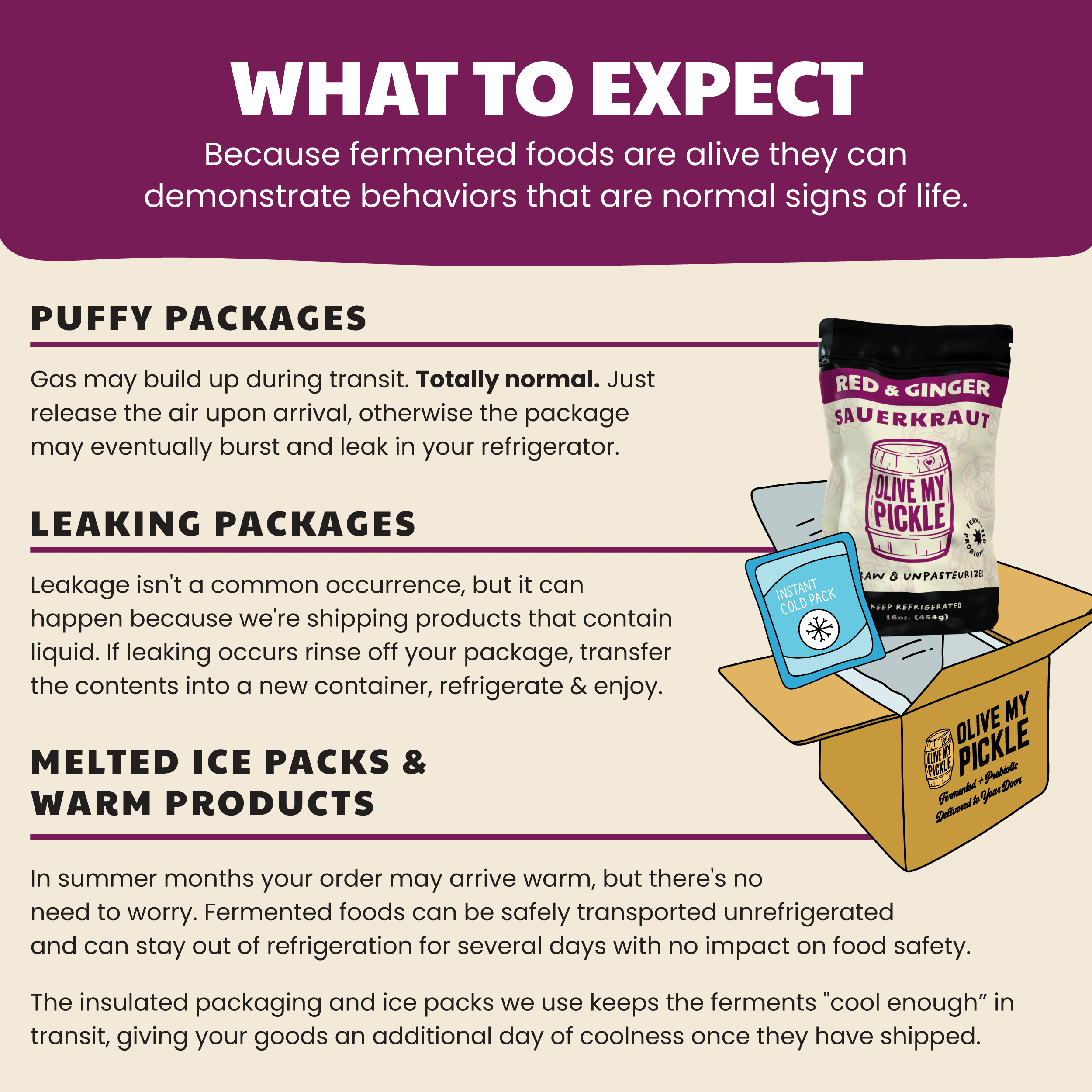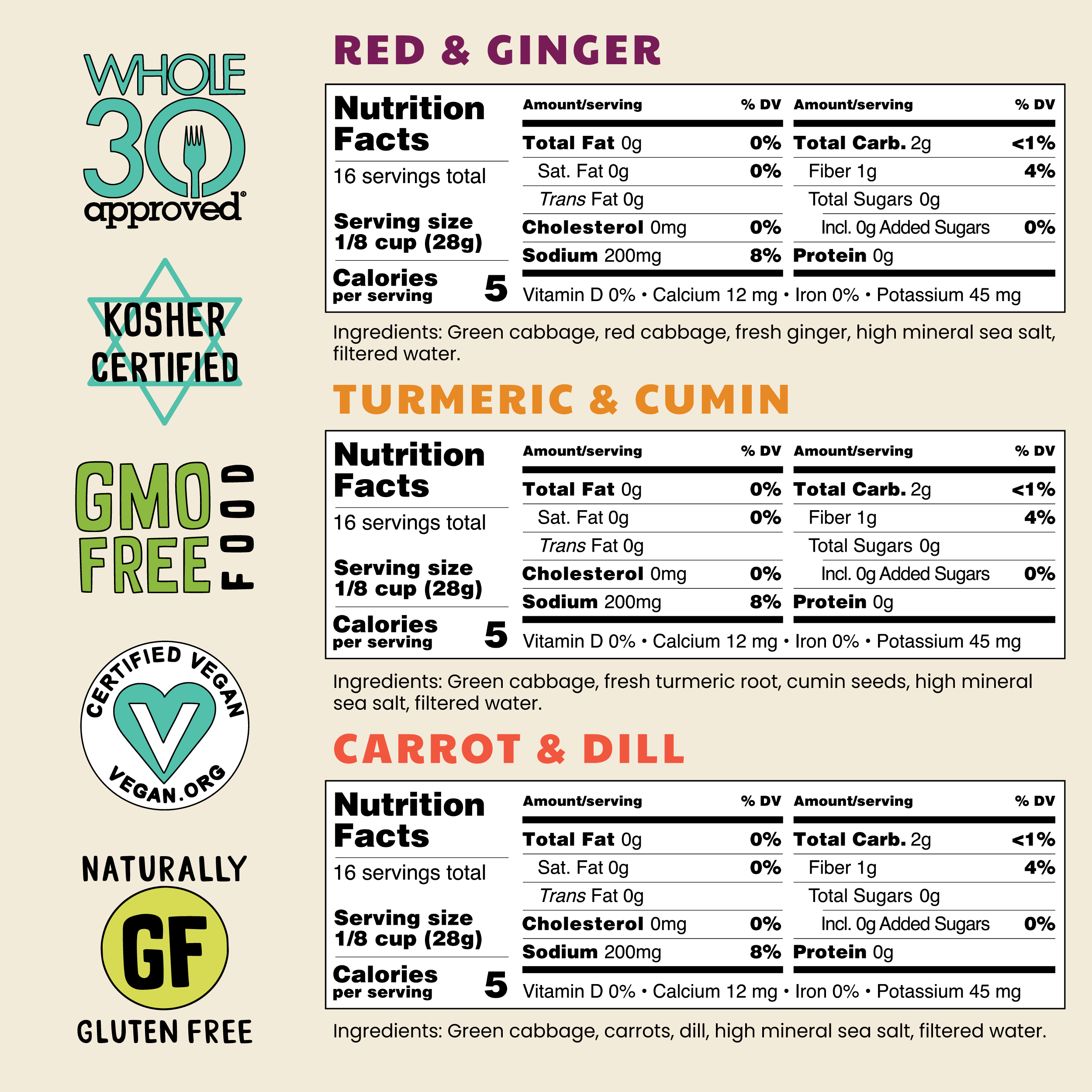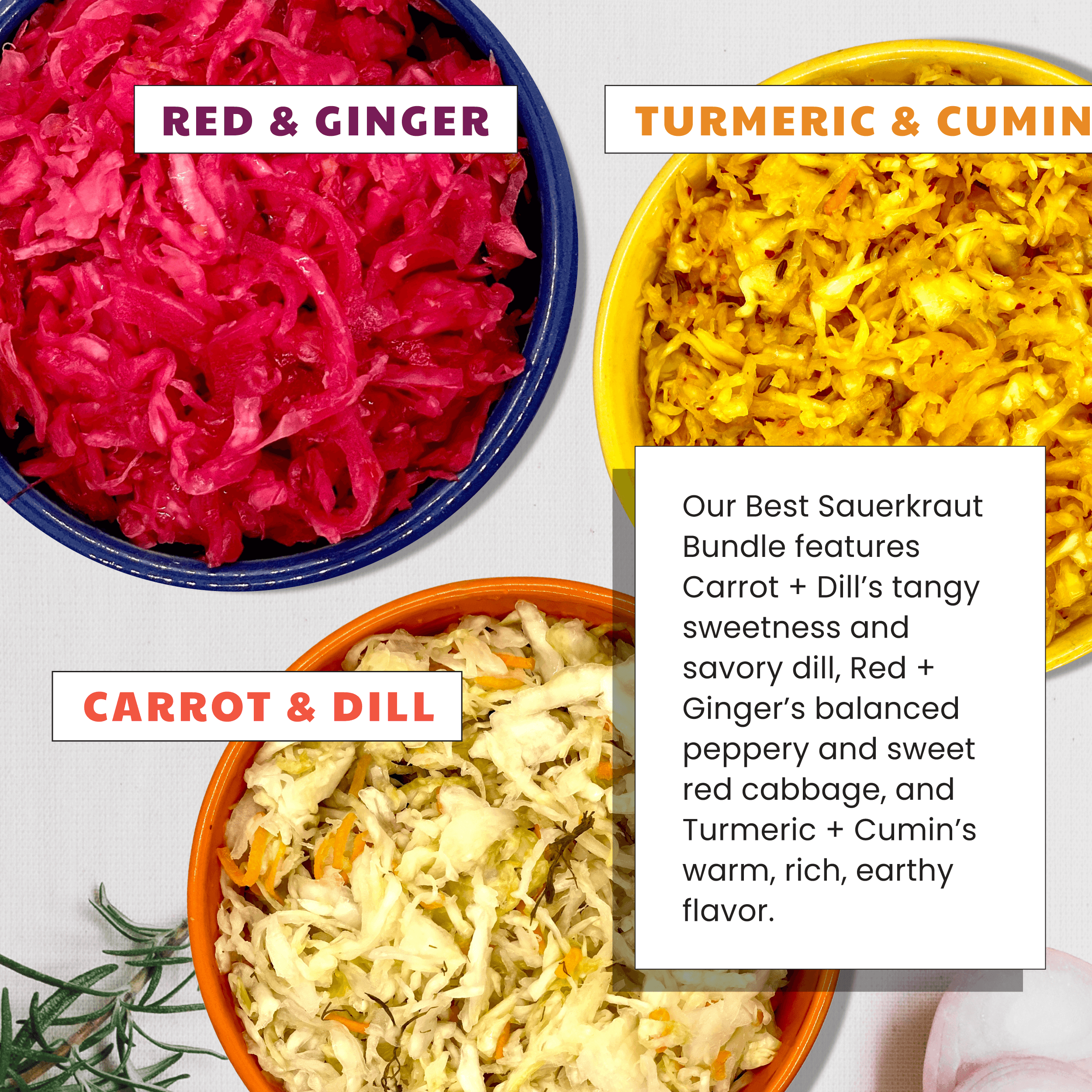 - Includes: (1) Red + Ginger Sauerkraut, (1) Carrot + Dill Sauerkraut (1) Turmeric + Cumin Sauerkraut