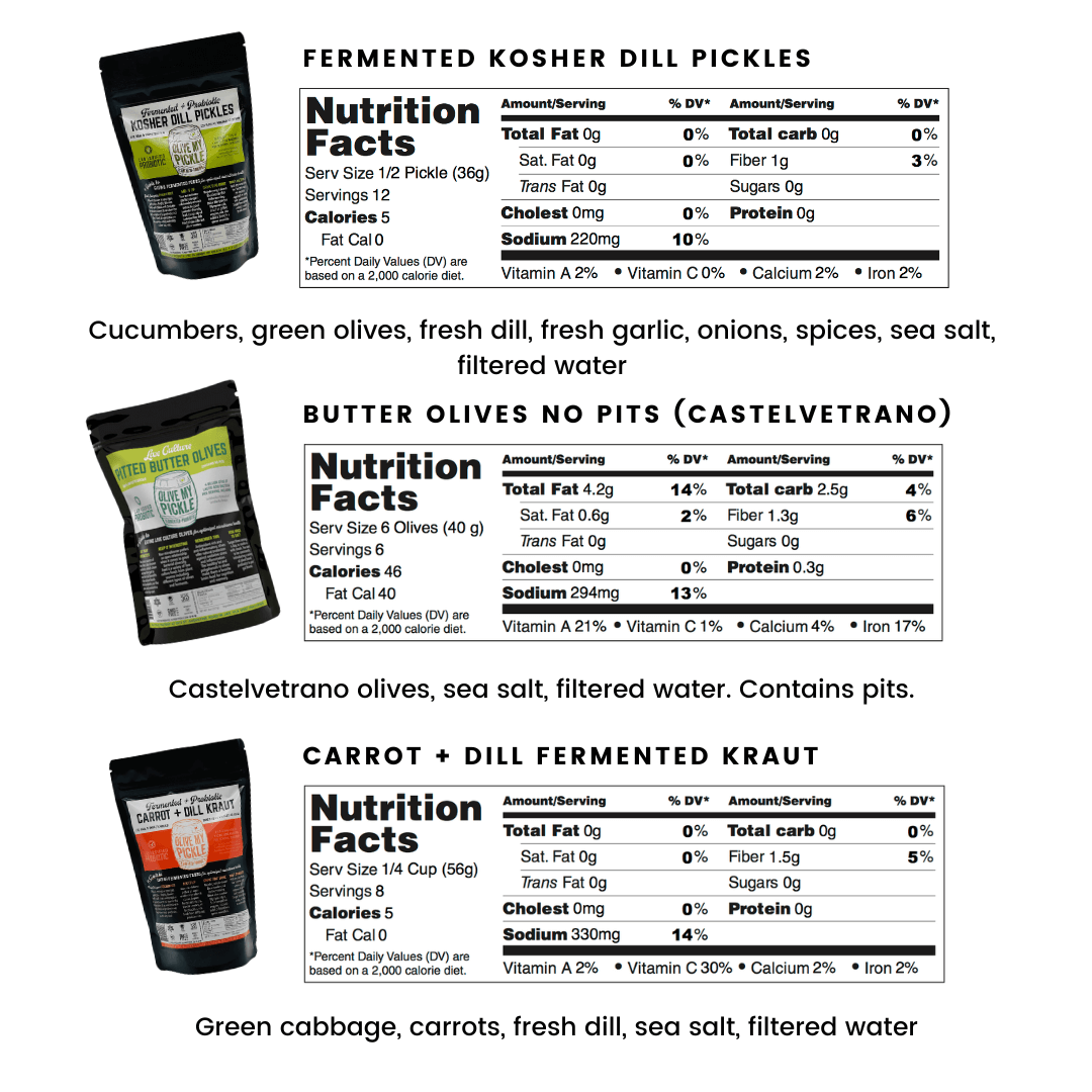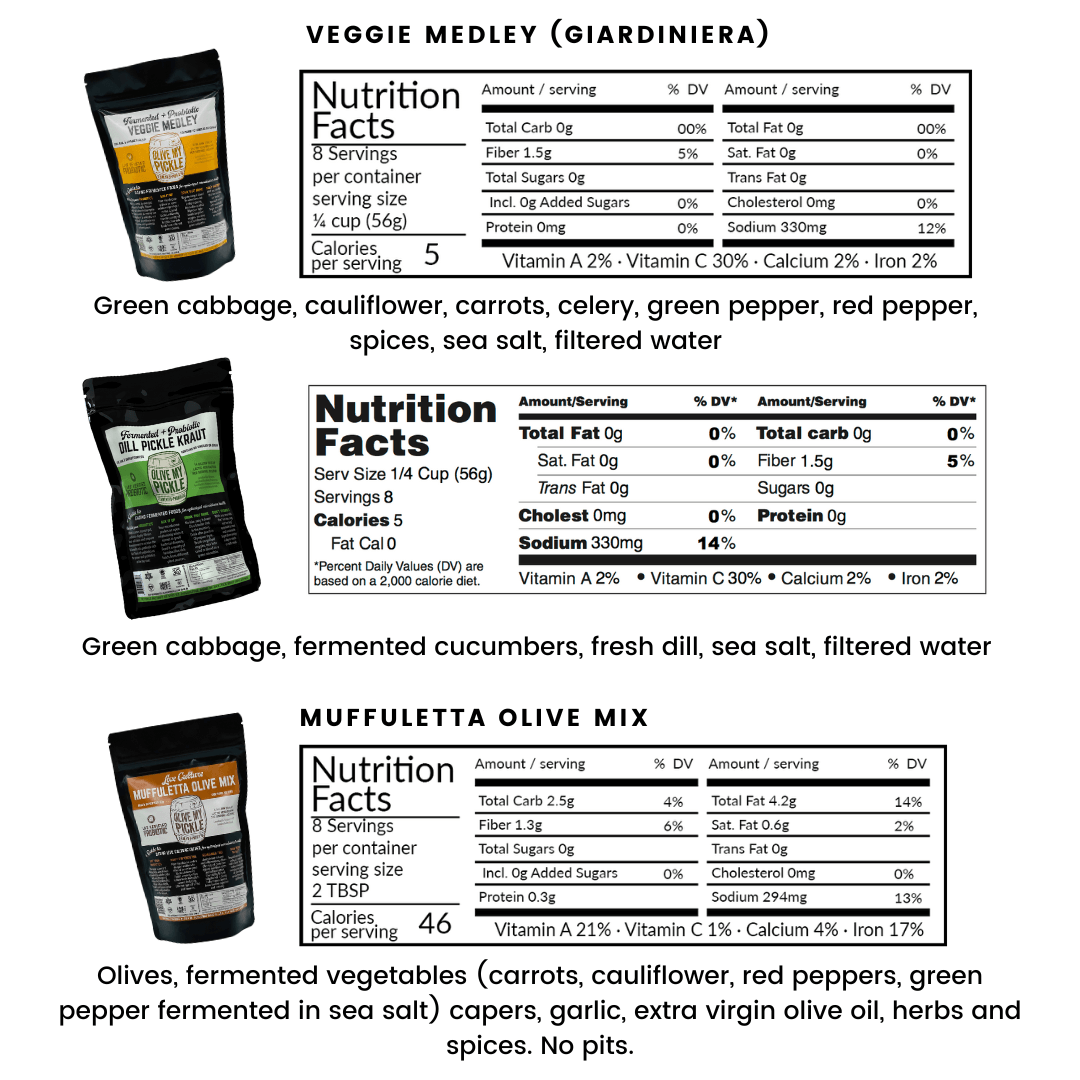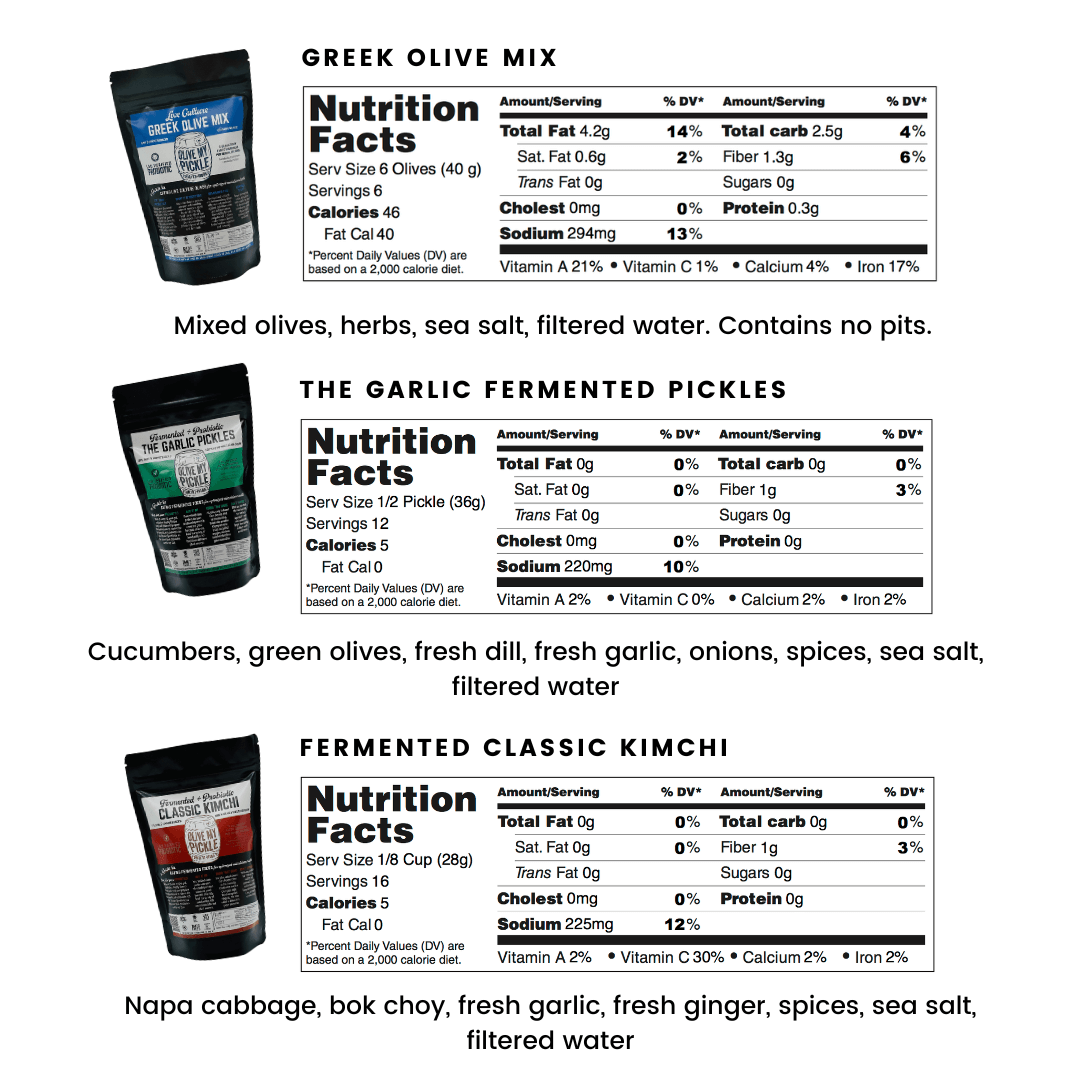 - This pack of our best-selling foods includes:(1) Kosher Dill Pickles, (1) The Garlic Pickles, (1) Carrot + Dill Sauerkraut, (1) Classic Kimchi, (1) Greek Olives, (1) Pitted Butter Olives (1) Muffuletta Olive Mix (1) Veggie Medley (1) Dill Pickle Sauerkraut (1) Classic Kosher Dill LiveBrine (1) Turmeric & Cracked Black Pepper LiveBrine (1) Dragon fruit & Strawberry LiveBrine *shot glasses sold separately