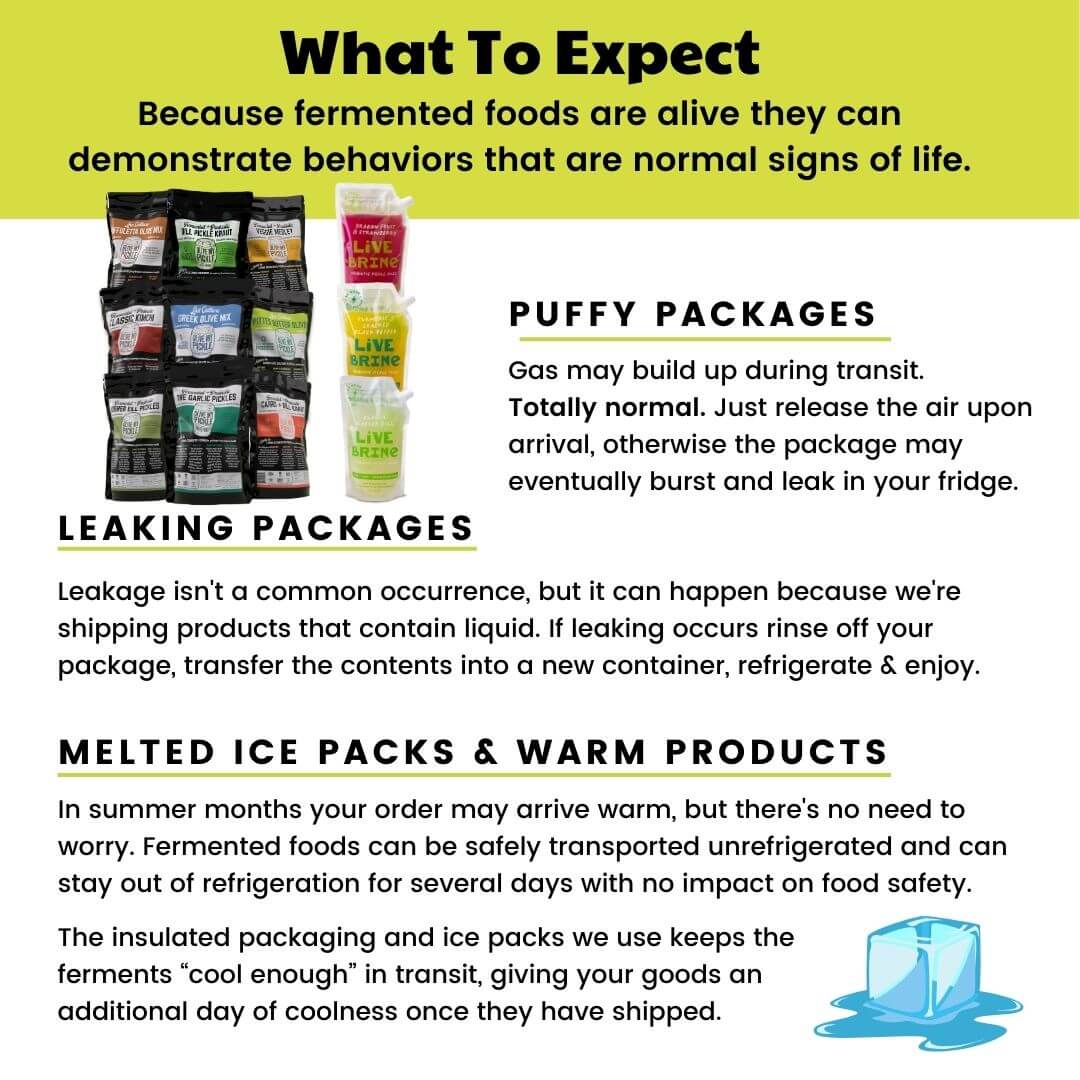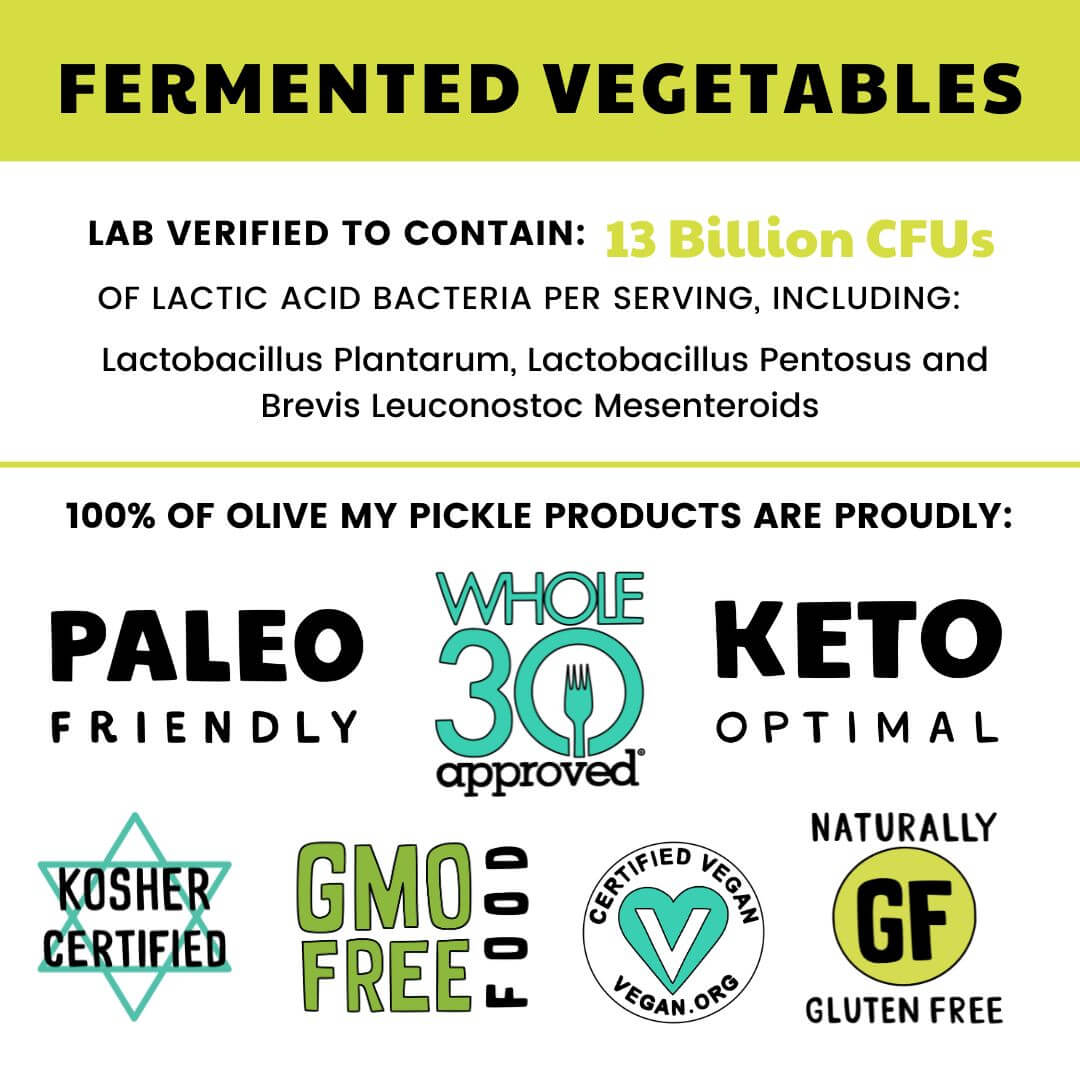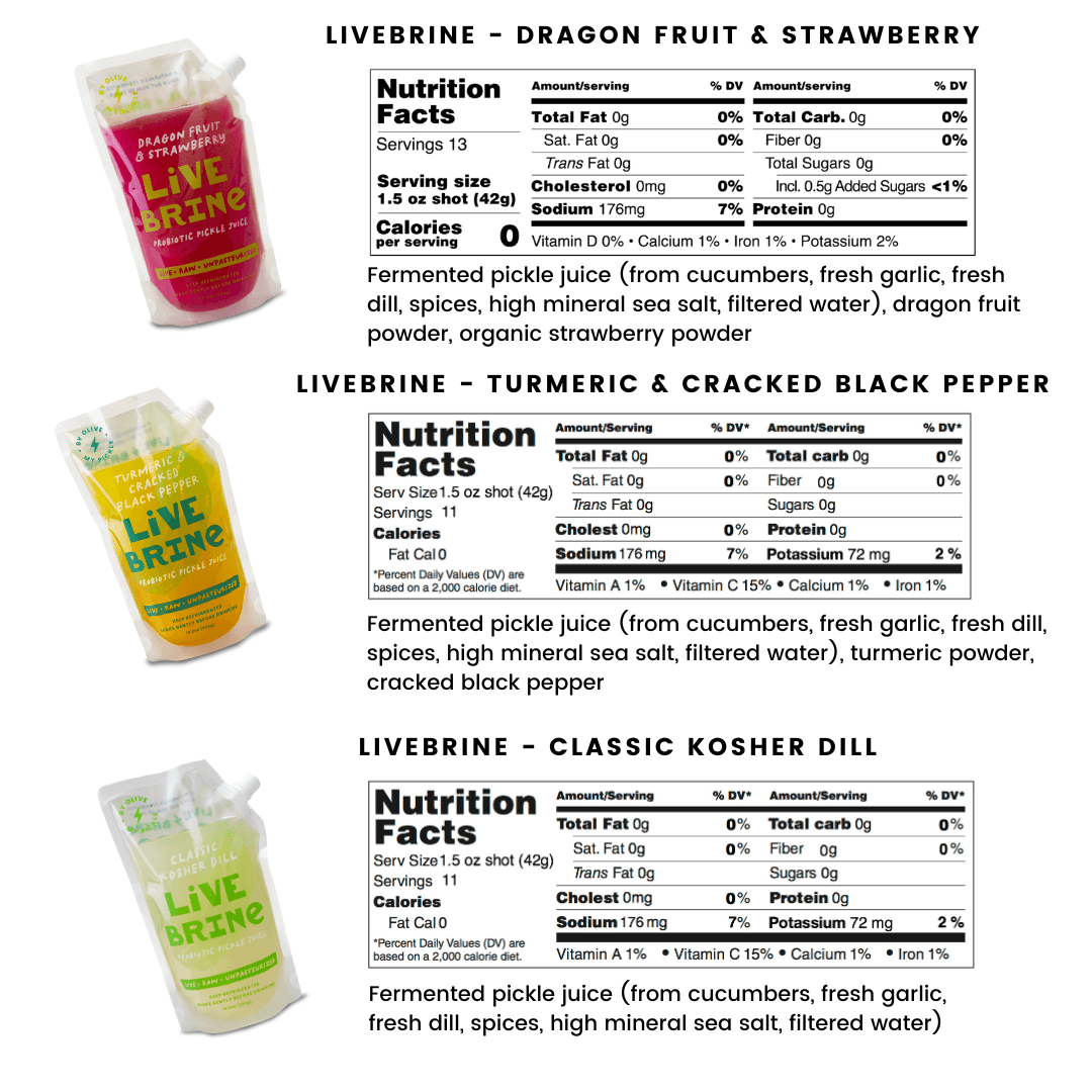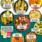 - This pack of our best-selling foods includes:(1) Kosher Dill Pickles, (1) The Garlic Pickles, (1) Carrot + Dill Sauerkraut, (1) Classic Kimchi, (1) Greek Olives, (1) Pitted Butter Olives (1) Muffuletta Olive Mix (1) Veggie Medley (1) Dill Pickle Sauerkraut (1) Classic Kosher Dill LiveBrine (1) Turmeric & Cracked Black Pepper LiveBrine (1) Dragon fruit & Strawberry LiveBrine *shot glasses sold separately