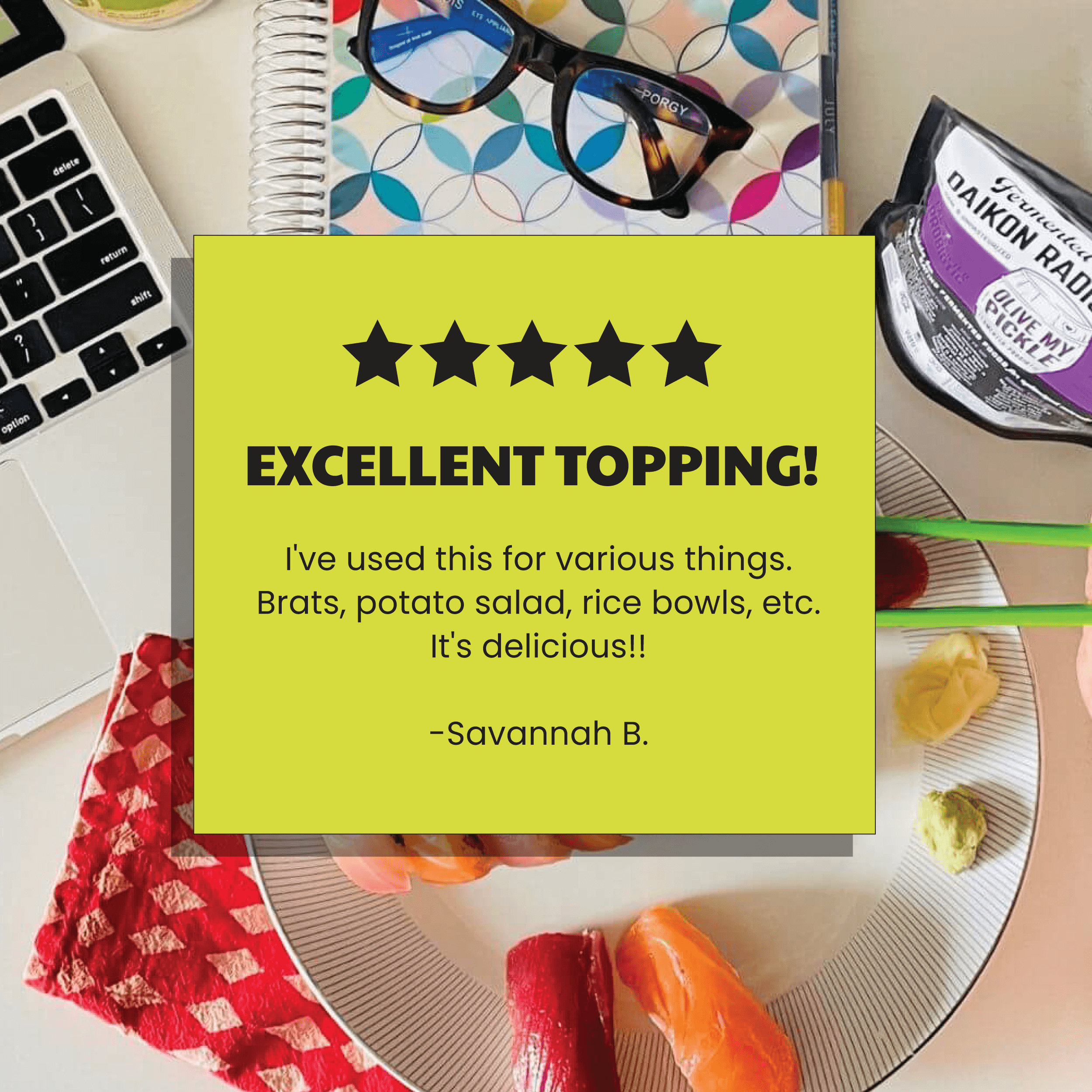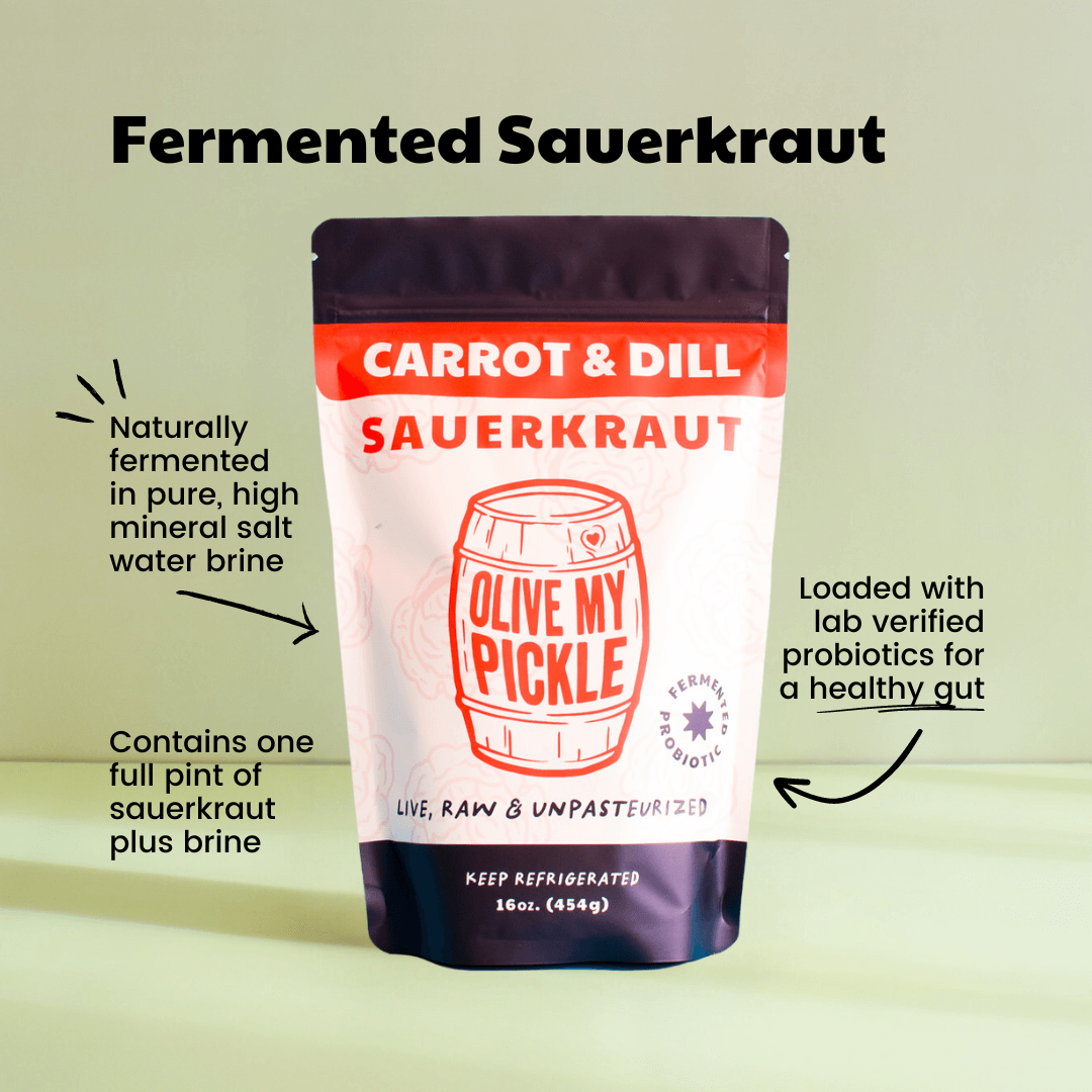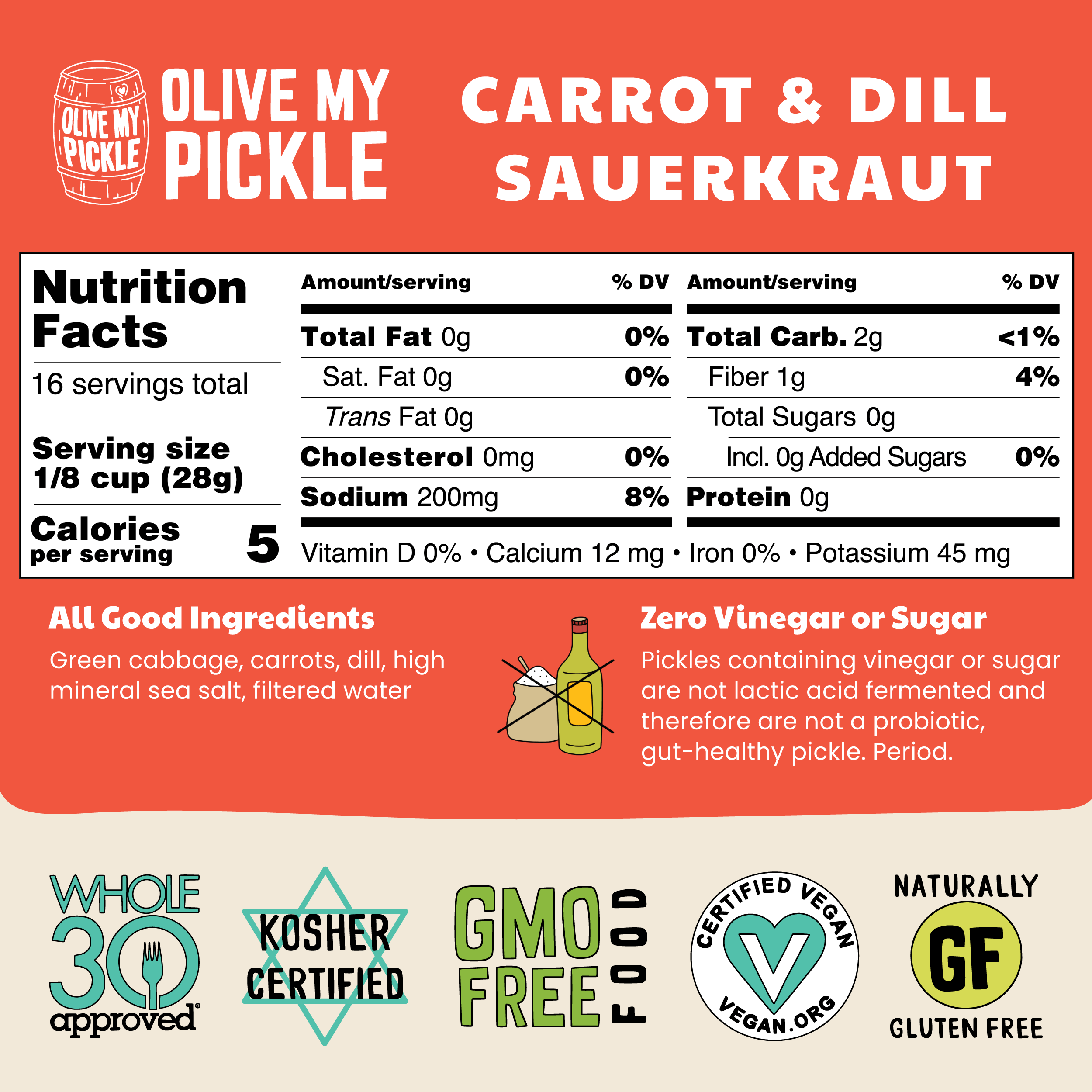 Carrot + Dill is our #1 sauerkraut for a reason. It's tangy and slightly sweet carrots harmonize with the savory notes of fresh dill.