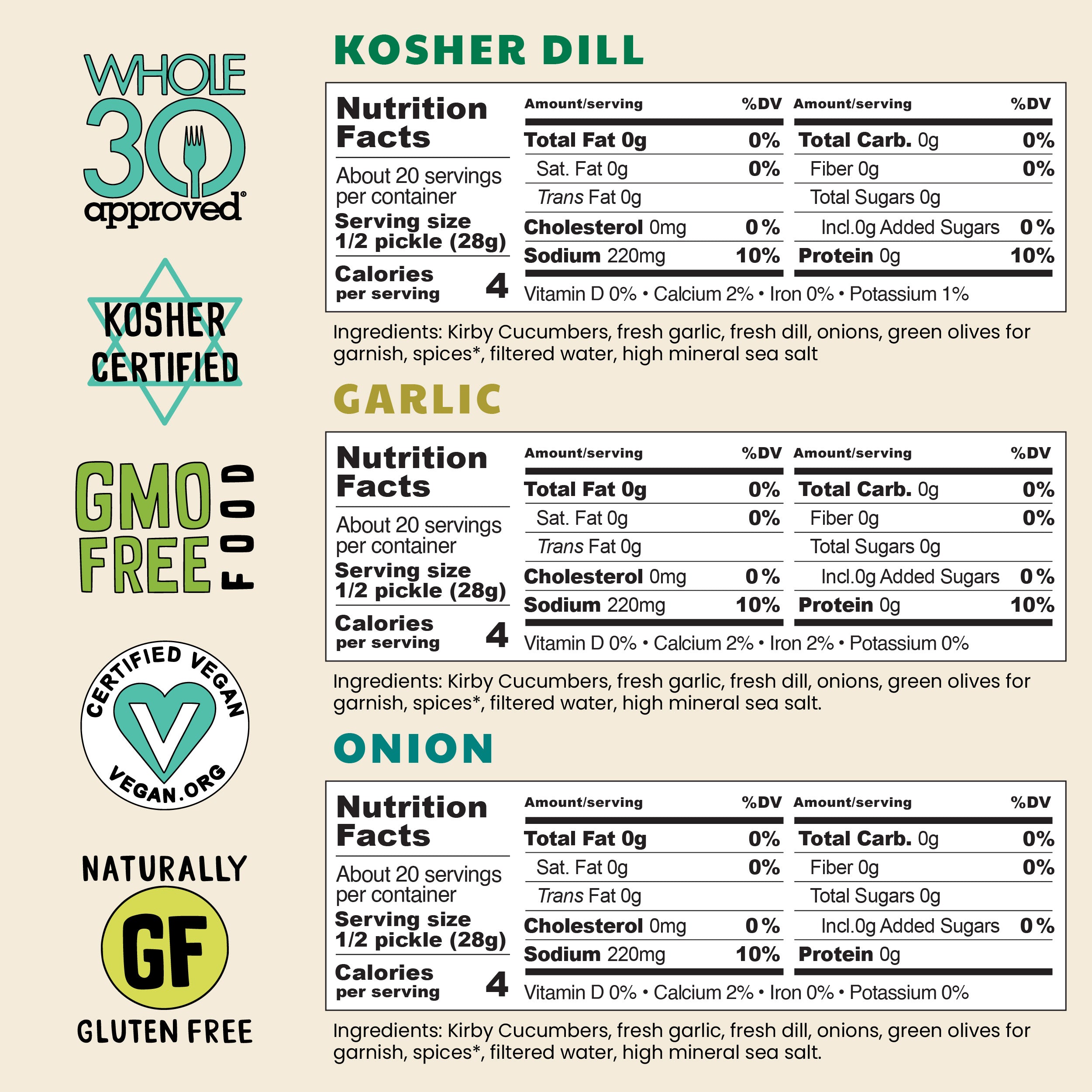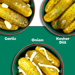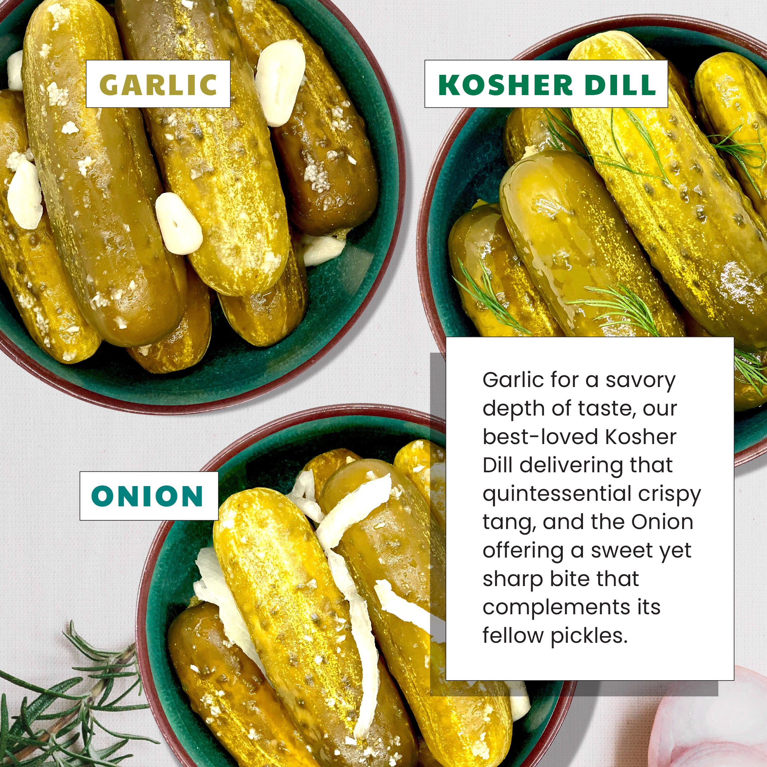 - Pickle bundle includes: (1) The Garlic Pickles, (1) Kosher Dill Pickles and (1) The Onion Pickles