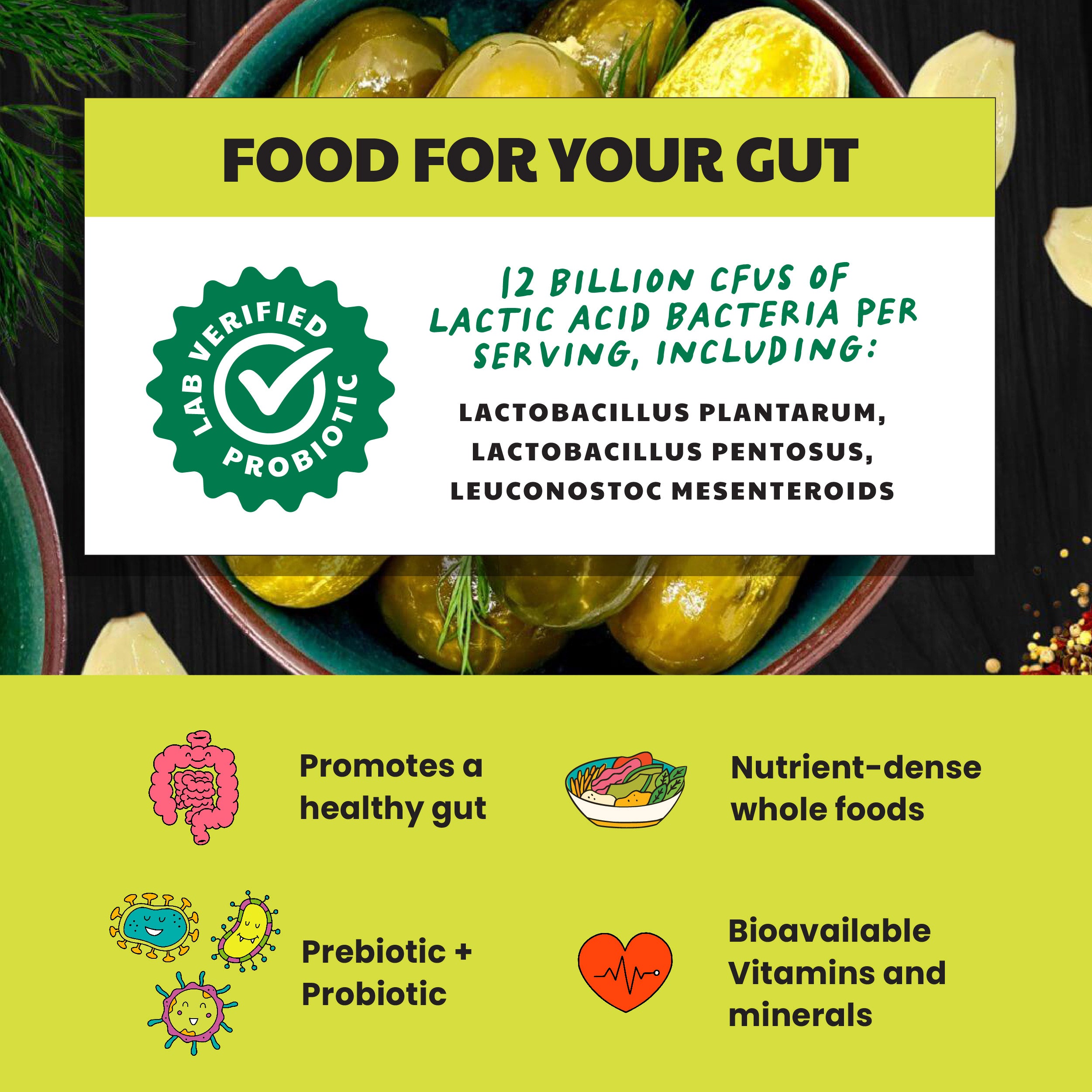 - Pickles naturally fermented in salt water brine and loaded with 12 billion CFUs of lactobacillus per serving.