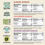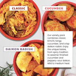 - Includes: (1) Daikon Radish Kimchi, (1) Classic Kimchi, and (1) Cucumber Kimchi