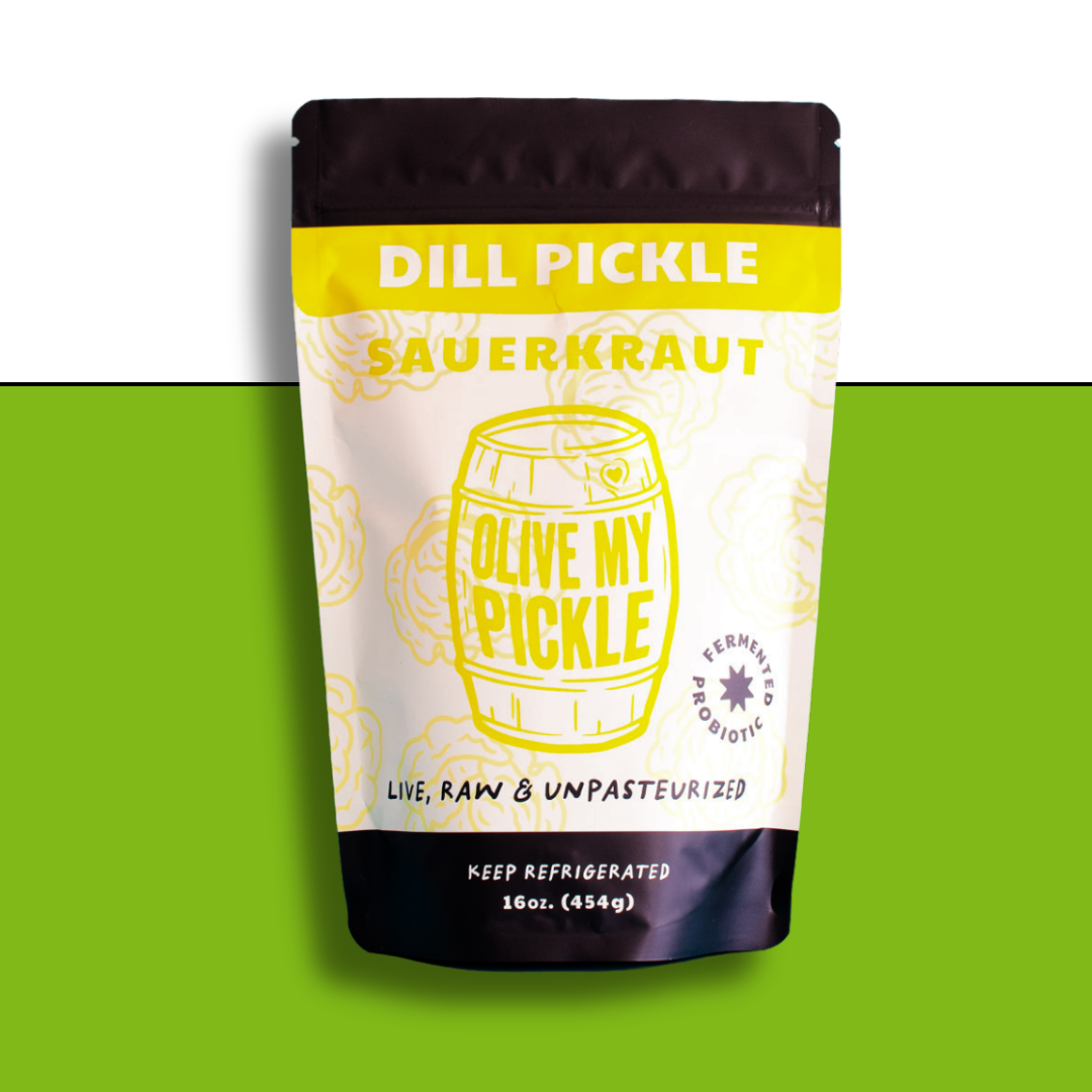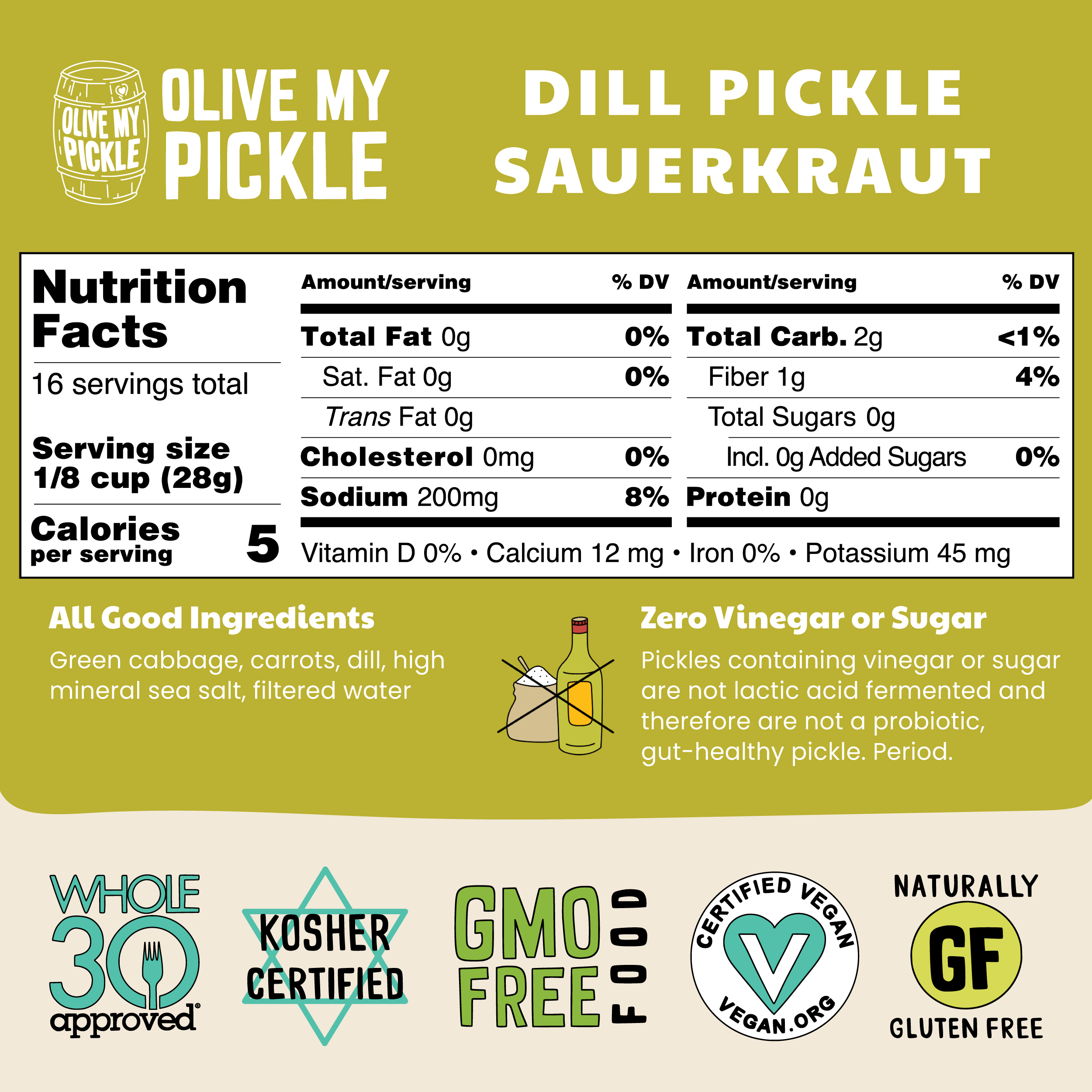 Dill Pickle Sauerkraut with probiotics is the perfect union of tart and tangy kraut with the familiar-favorite flavor of fermented pickles.
