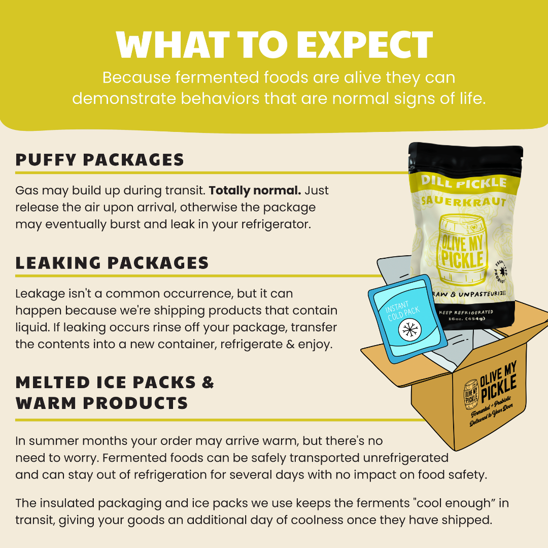 - One package contains 16 ounces, equaling one full pint of kraut plus brine.