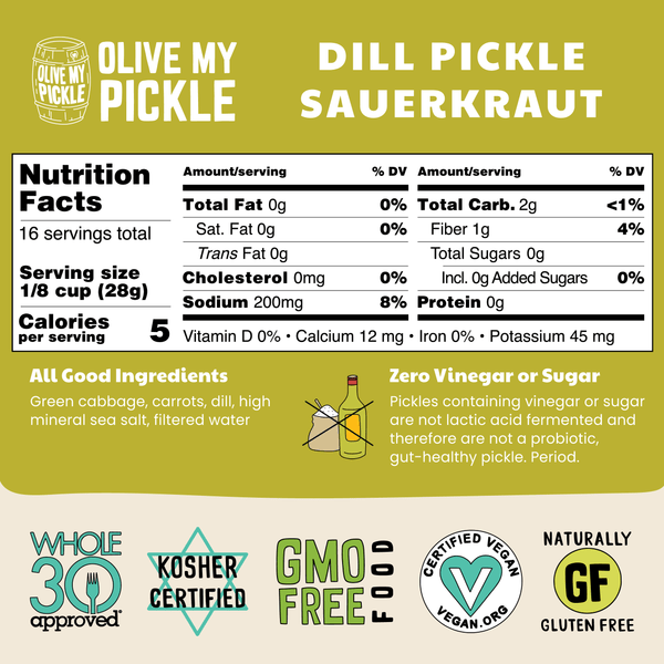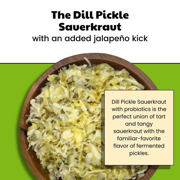Dill Pickle Sauerkraut with probiotics is the perfect union of tart and tangy kraut with the familiar-favorite flavor of fermented pickles.