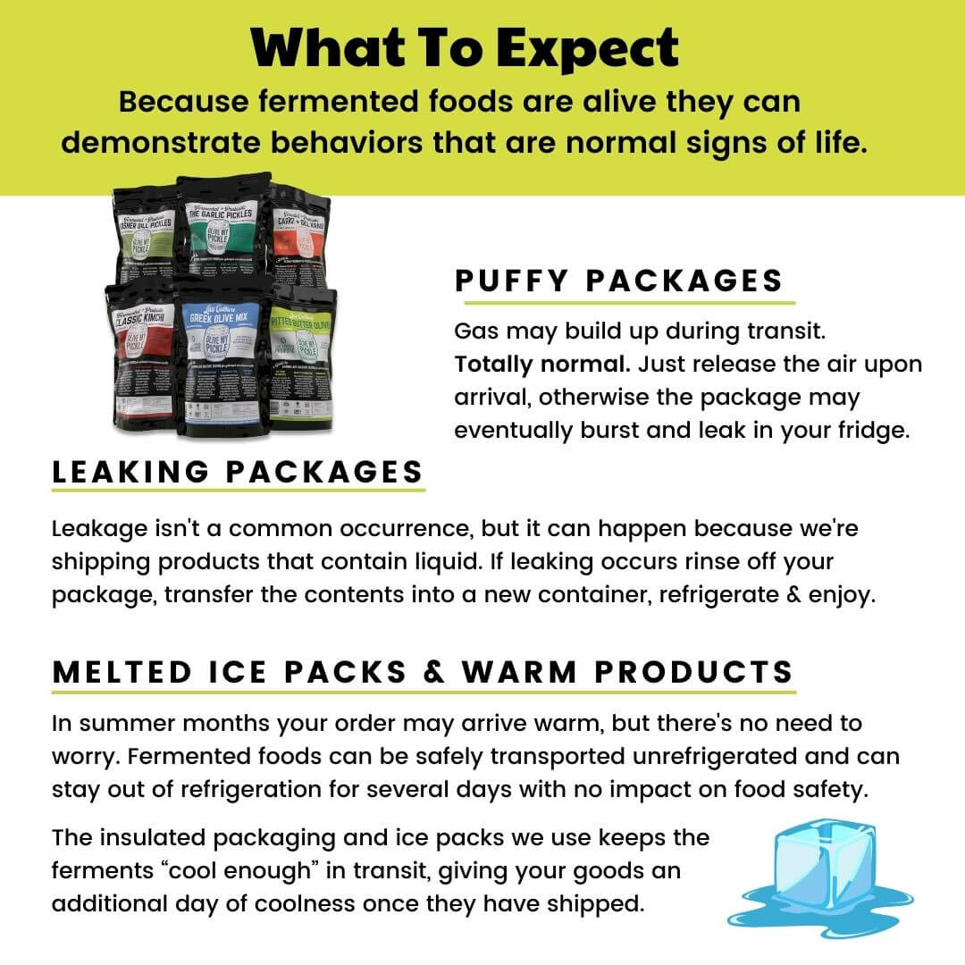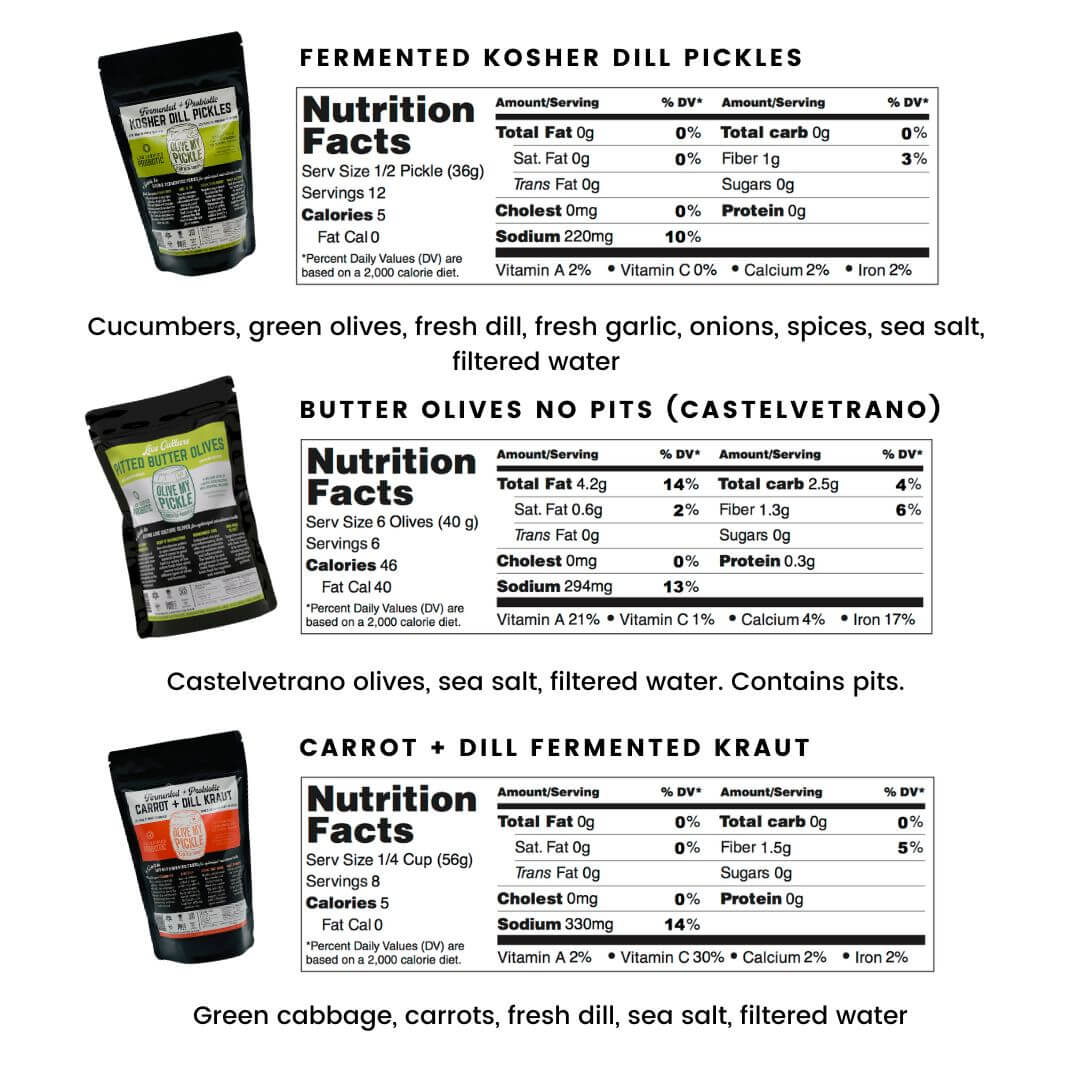 - Fermented Food Bundle Includes: (1) Kosher Dill Pickles, (1) The Garlic Pickles, (1) Carrot + Dill Sauerkraut, (1) Classic Kimchi, (1) Greek Olives, (1) Pitted Butter Olives