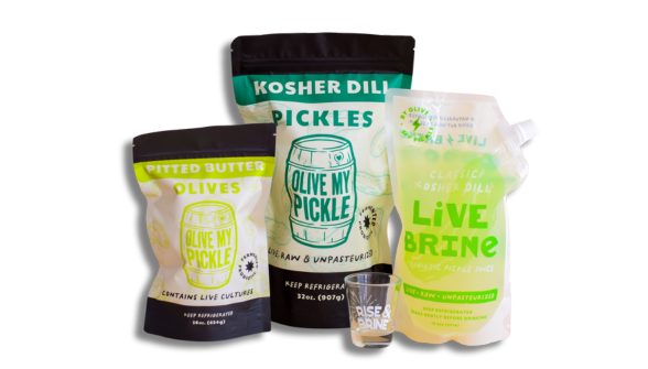 - Includes: (1) Kosher Dill Pickles, (1) The Garlic Pickles, (1) Onion Pickles, (1) Spicy Pickles (1) Horseradish Pickles (1) Dill Pickle Sauerkraut (1) Cucumber Kimchi (1) Pickle My Olive (1) Classic Kosher Dill LiveBrine - *shot glass sold separately