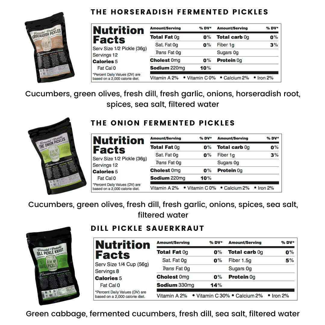 - Includes: (1) Kosher Dill Pickles, (1) The Garlic Pickles, (1) Onion Pickles, (1) Spicy Pickles (1) Horseradish Pickles (1) Dill Pickle Sauerkraut (1) Cucumber Kimchi (1) Pickle My Olive (1) Classic Kosher Dill LiveBrine - *shot glass sold separately