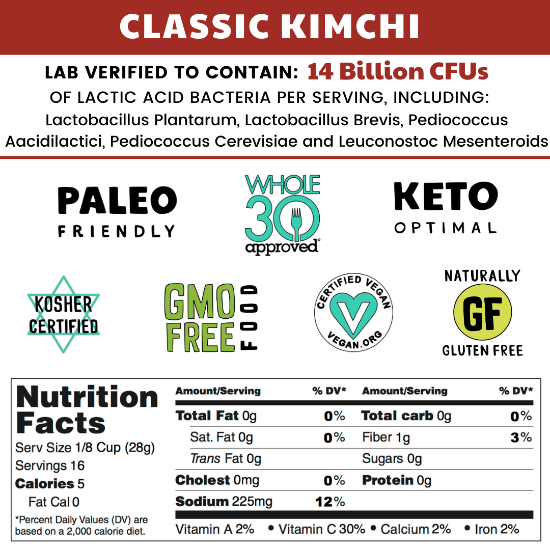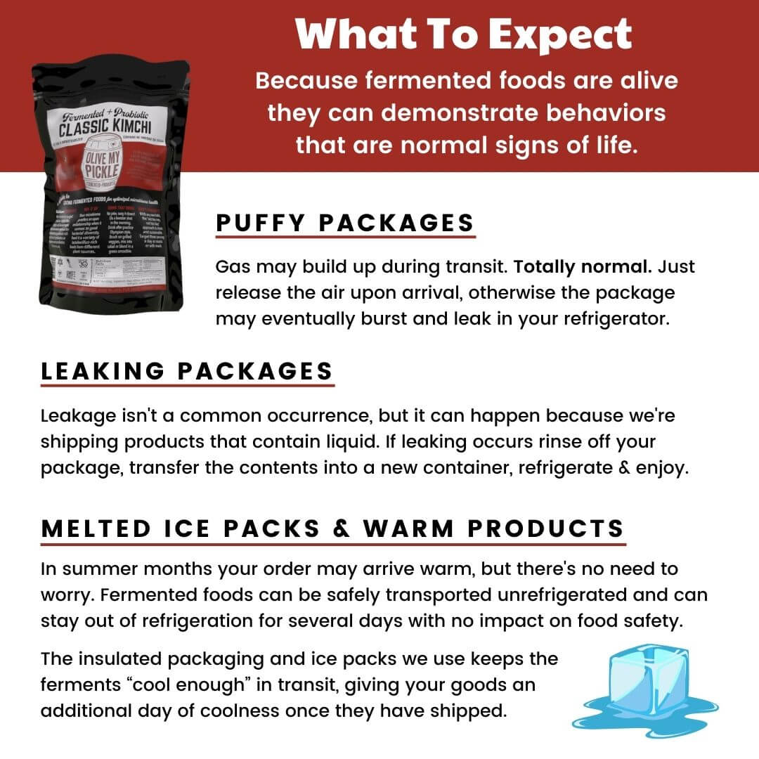 - One package contains 16 ounces, equaling one full pint of fermented kimchi plus brine.