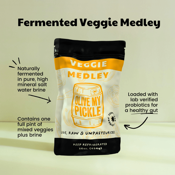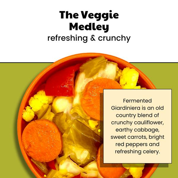 Fermented giardiniera is an old country blend of crunchy cauliflower, earthy cabbage, sweet carrots, bright red peppers and refreshing celery.