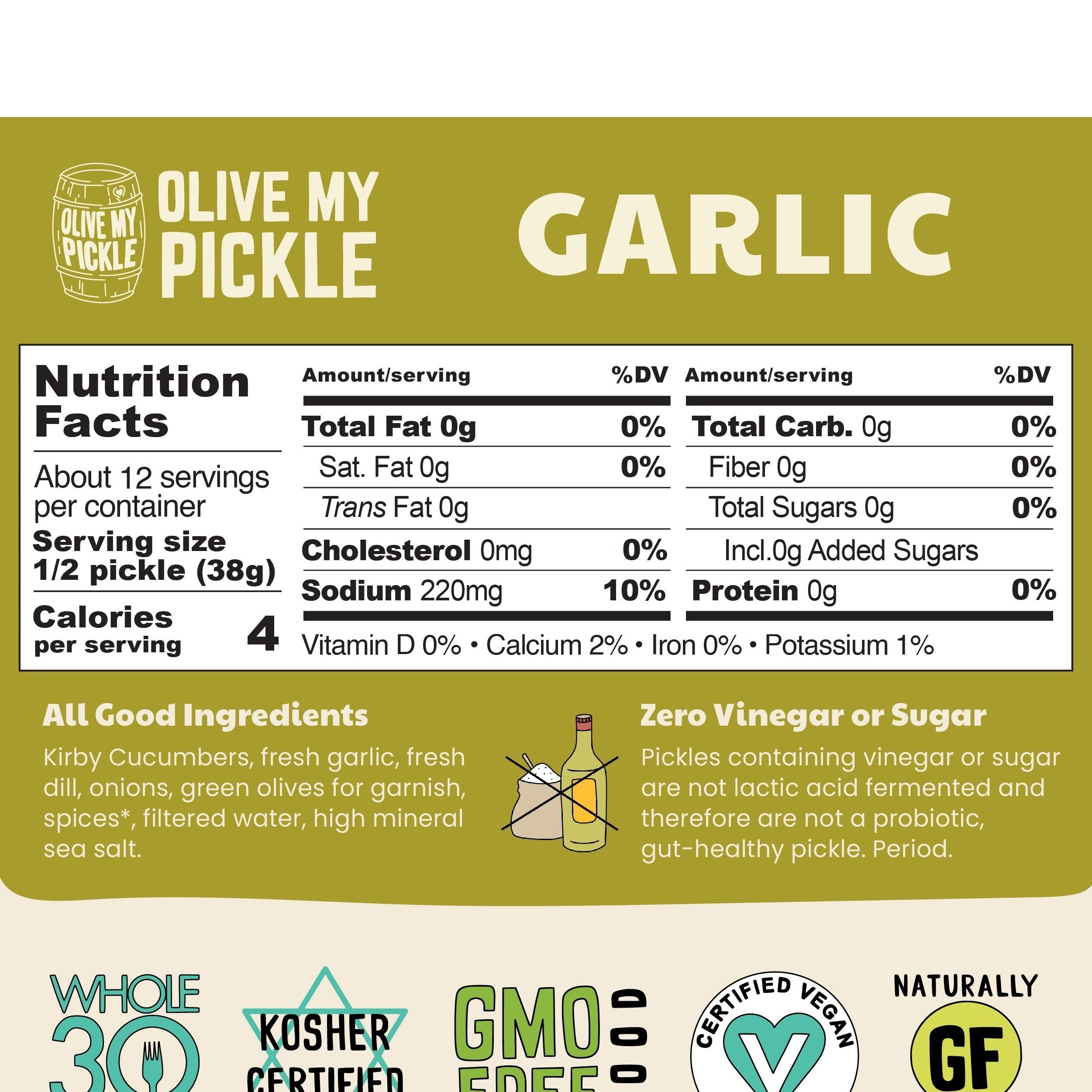 Garlic is our flavor packed fermented pickle, perfect for fans of a classic full sour. Fresh and crunchy and slathered in a smooth and savory garlic puree, experience garlic pickles for sale from Olive My Pickle today!