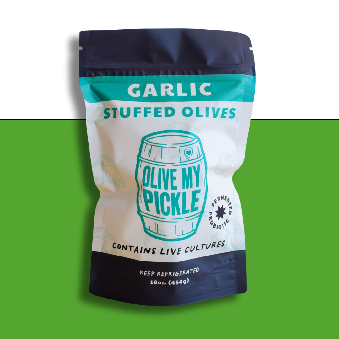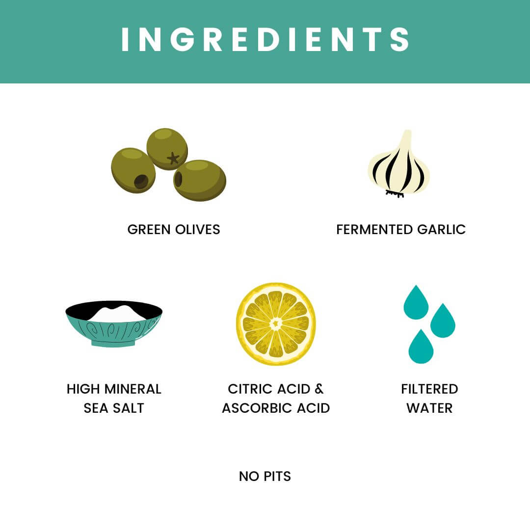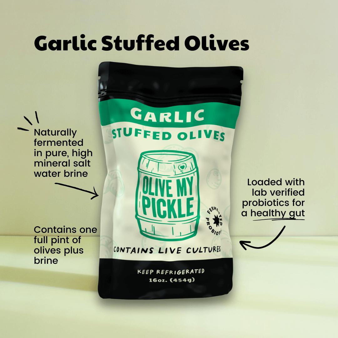 - Olives stuffed with garlic and naturally fermented in salt water brine.