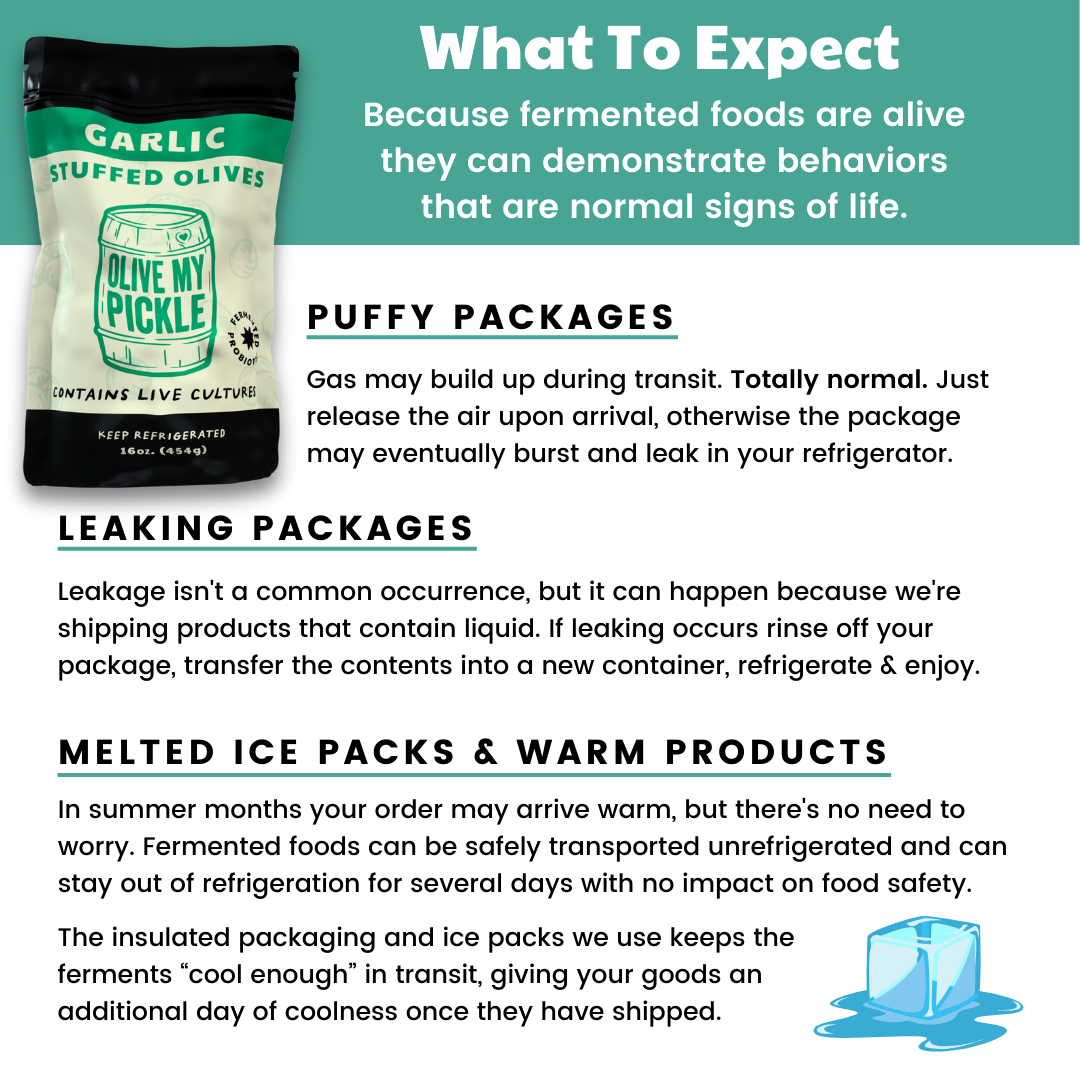 - One package contains 16 ounces, equaling one full pint of fermented olives plus brine.