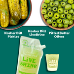 - Includes: (1) Pitted Butter Olives, (1) Kosher Dill LiveBrine (1) Kosher Dill Pickles