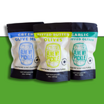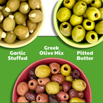 - Includes: (1) Garlic Stuffed Olives, (1) Pitted Butter Olives, and (1) Greek Olives