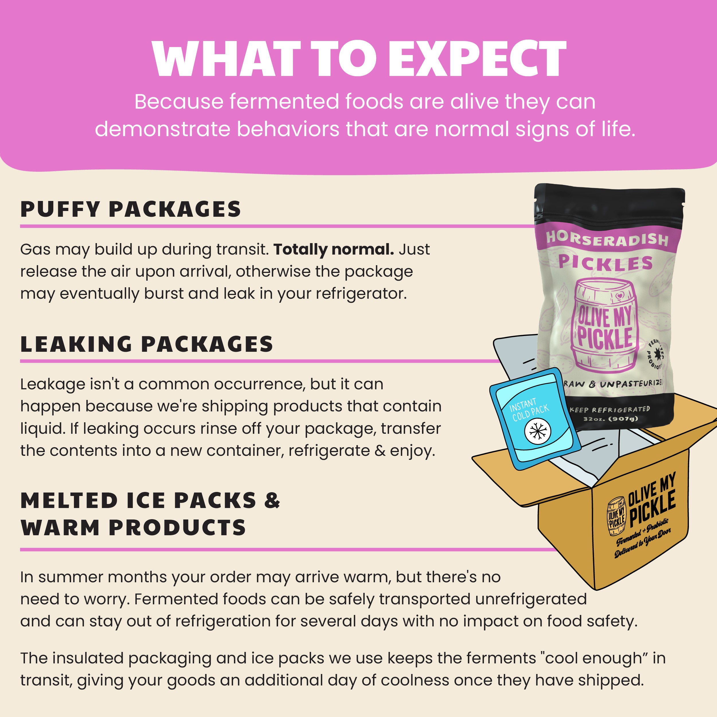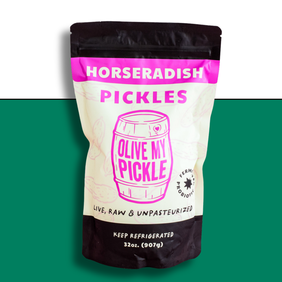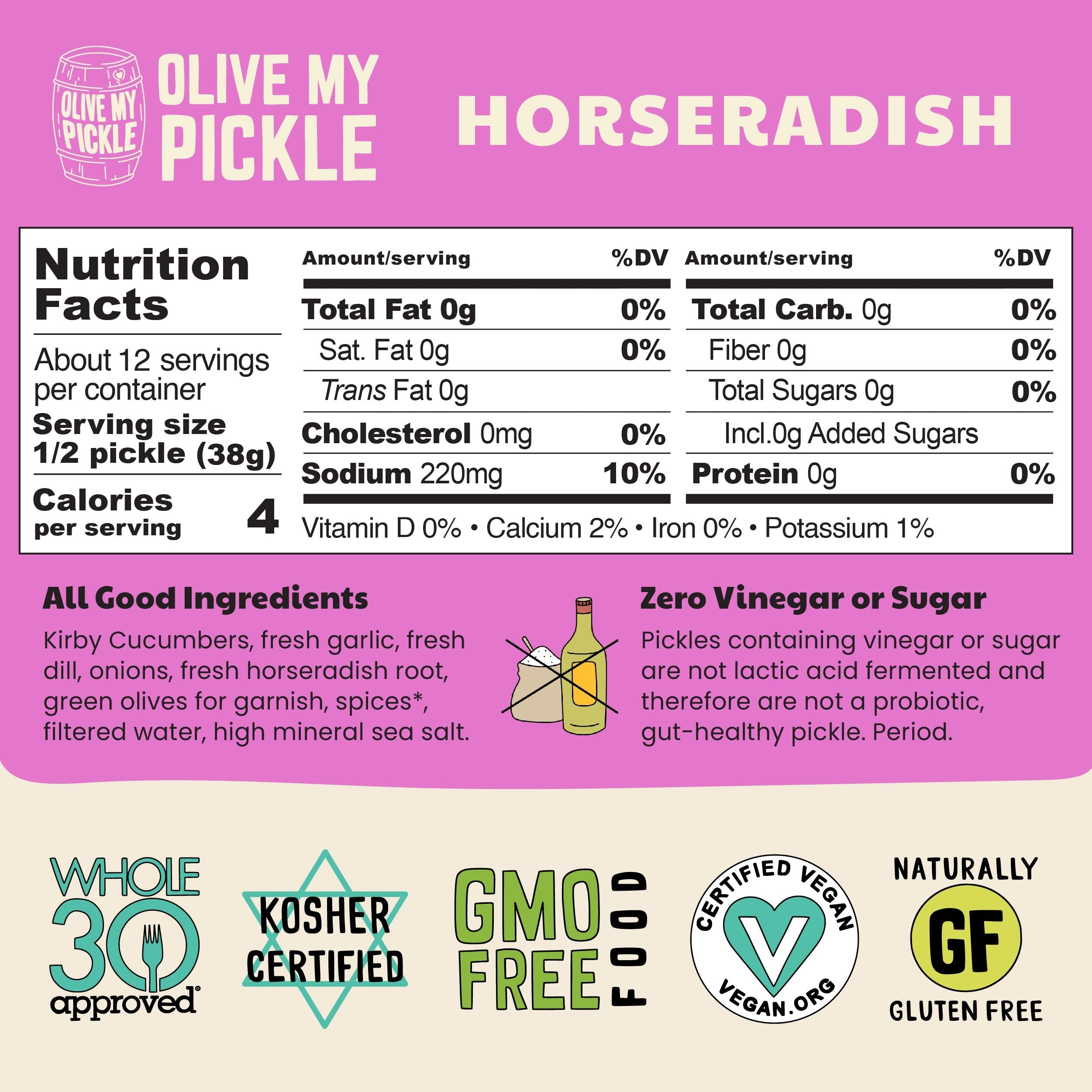 - Each 32 oz package contains over 1 pound of horseradish dill pickles plus probiotic brine.