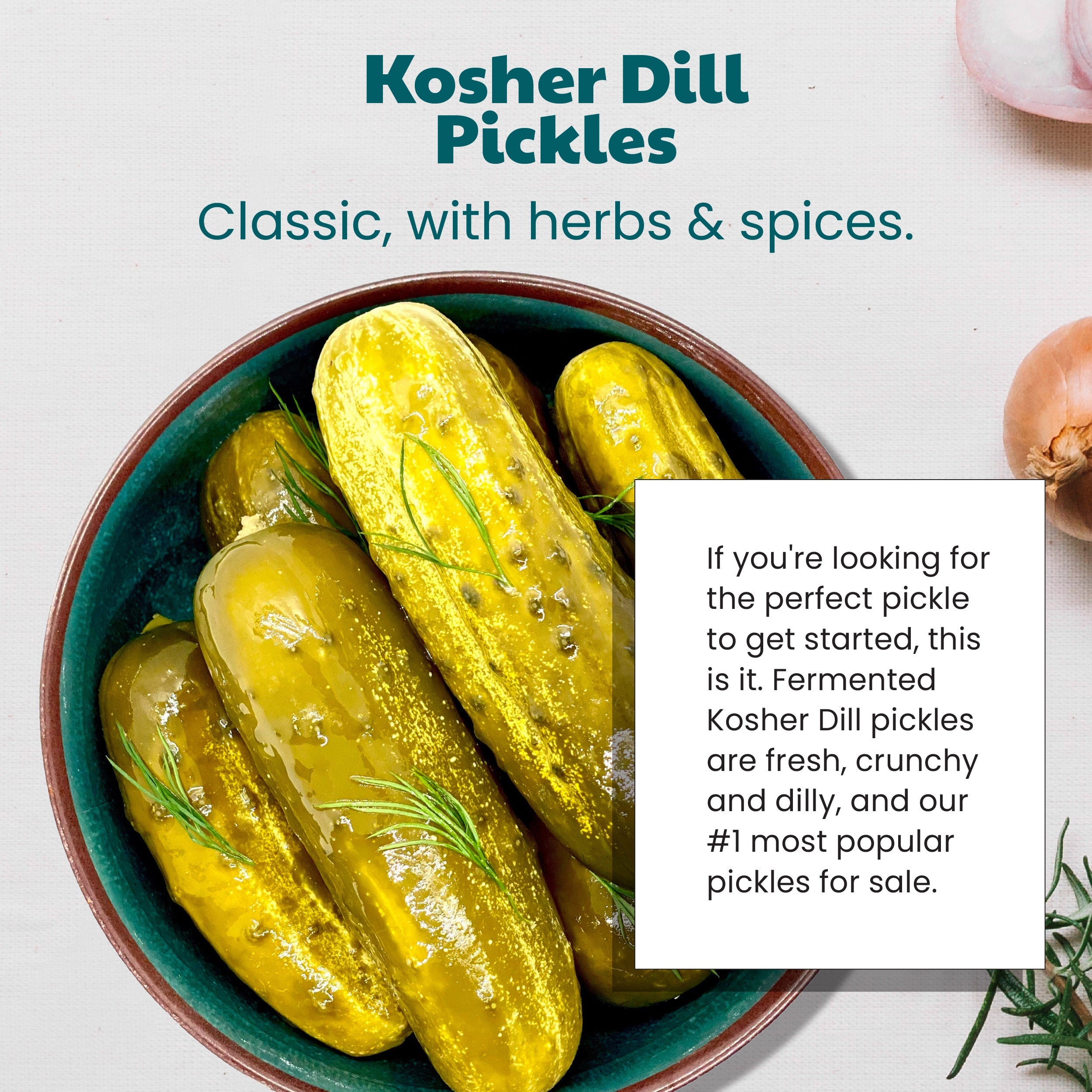 If you're looking for the perfect pickle to get started, this is it. Fermented Kosher Dill pickles are fresh, crunchy and dilly and our #1 most popular salt water brine pickles for sale.