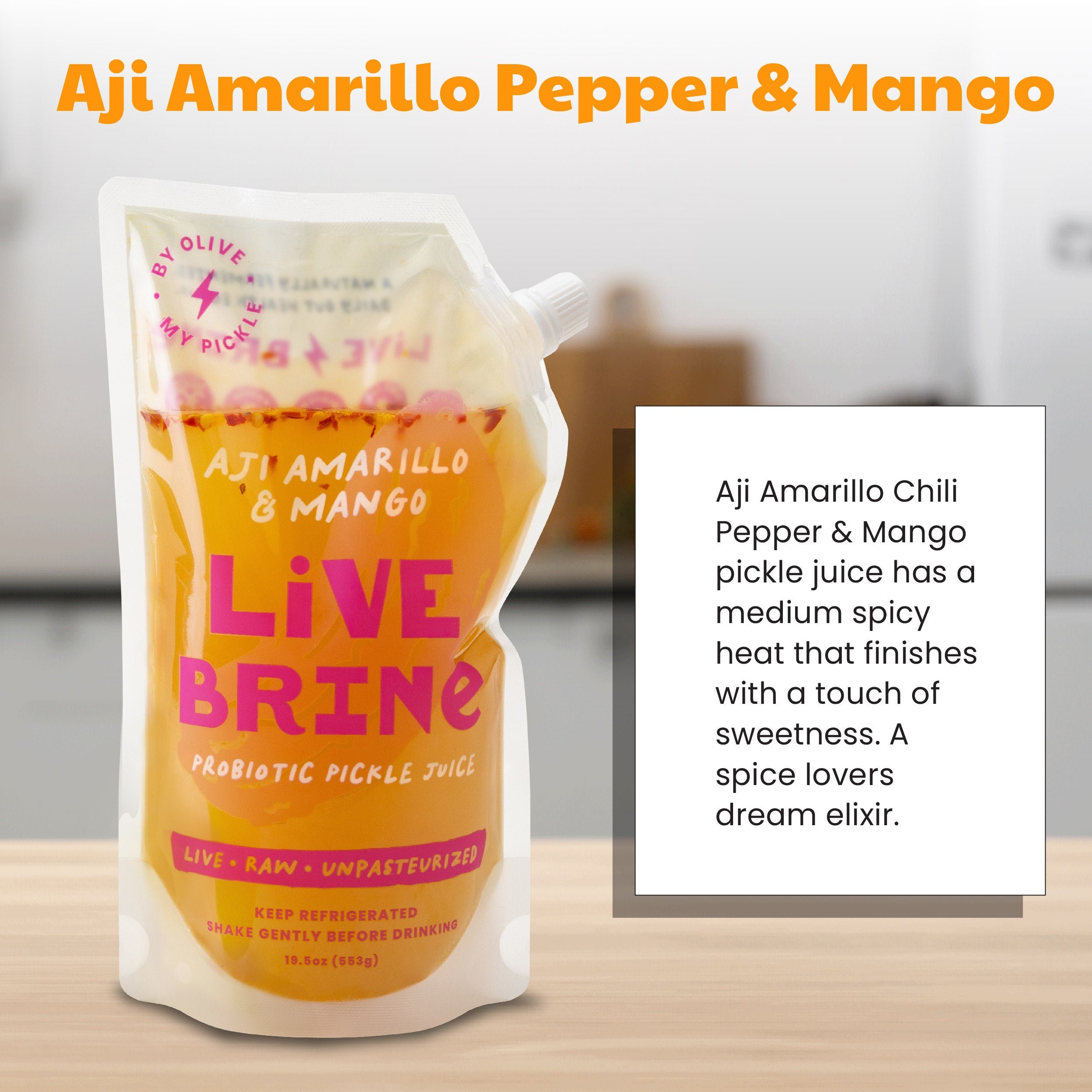 Aji Amarillo Chili Pepper & Mango pickle juice has a medium spicy heat that finishes with a touch of sweetness. This LiveBrine probiotic pickle juice is a spice lover’s dream elixir.
