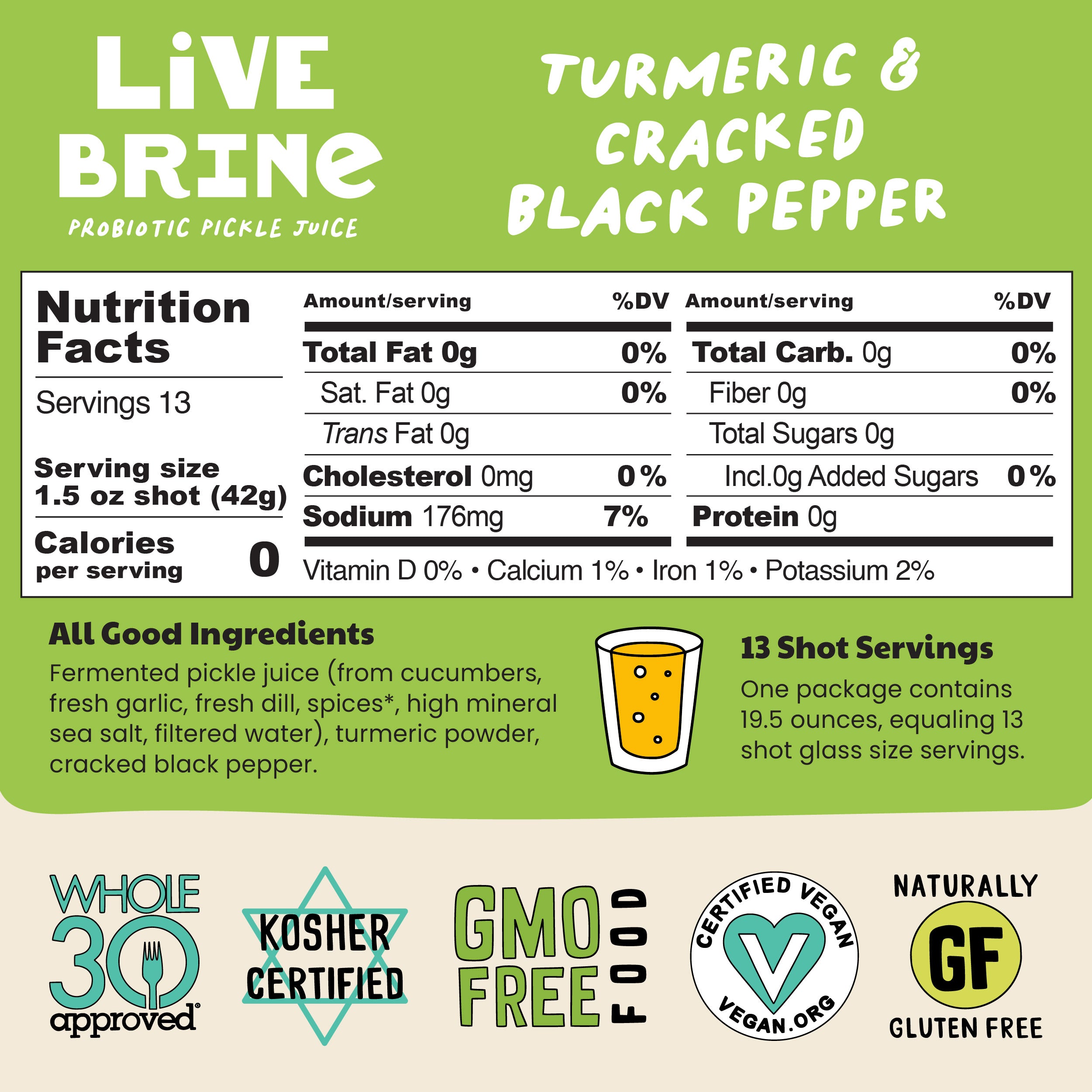 - One package contains 19.5 ounces, equaling 13 shot glass size servings.