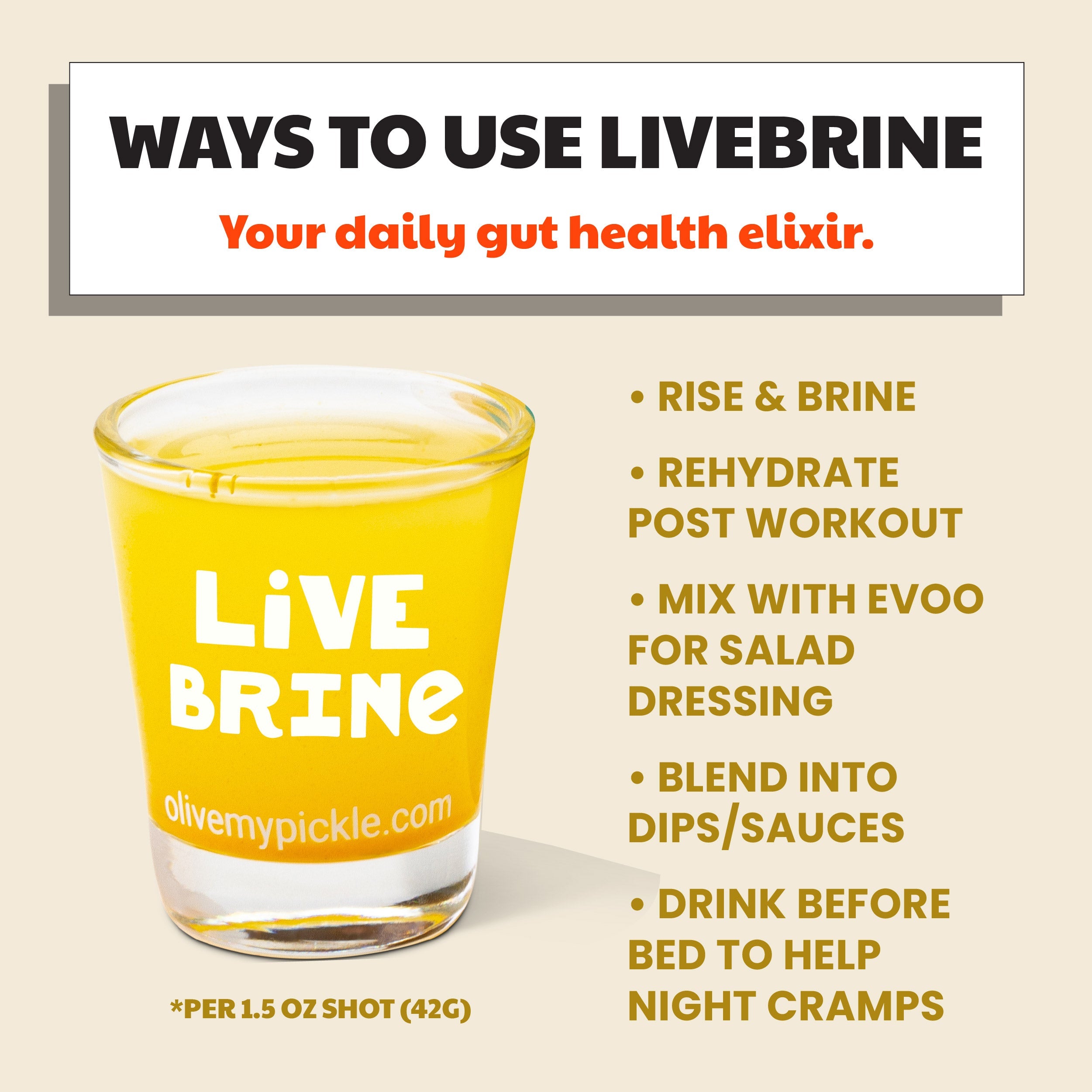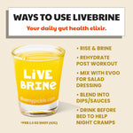 - LiveBrine pickle juice shots are made from naturally fermented, salt water brine pickles. Loaded with 13 billion CFUs of lactobacillus per serving.