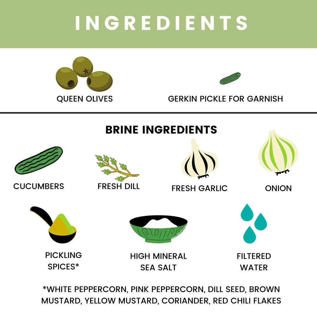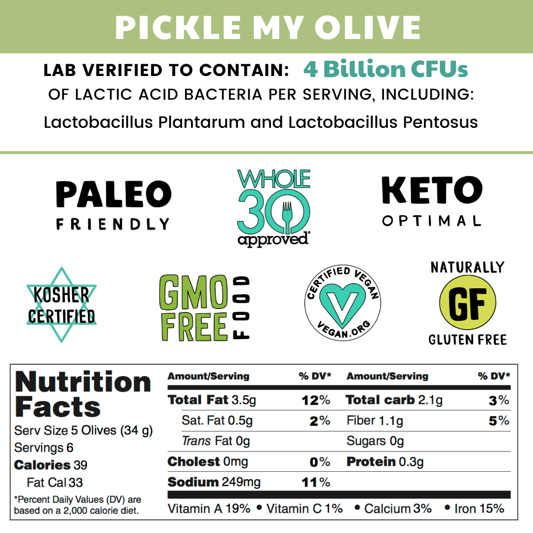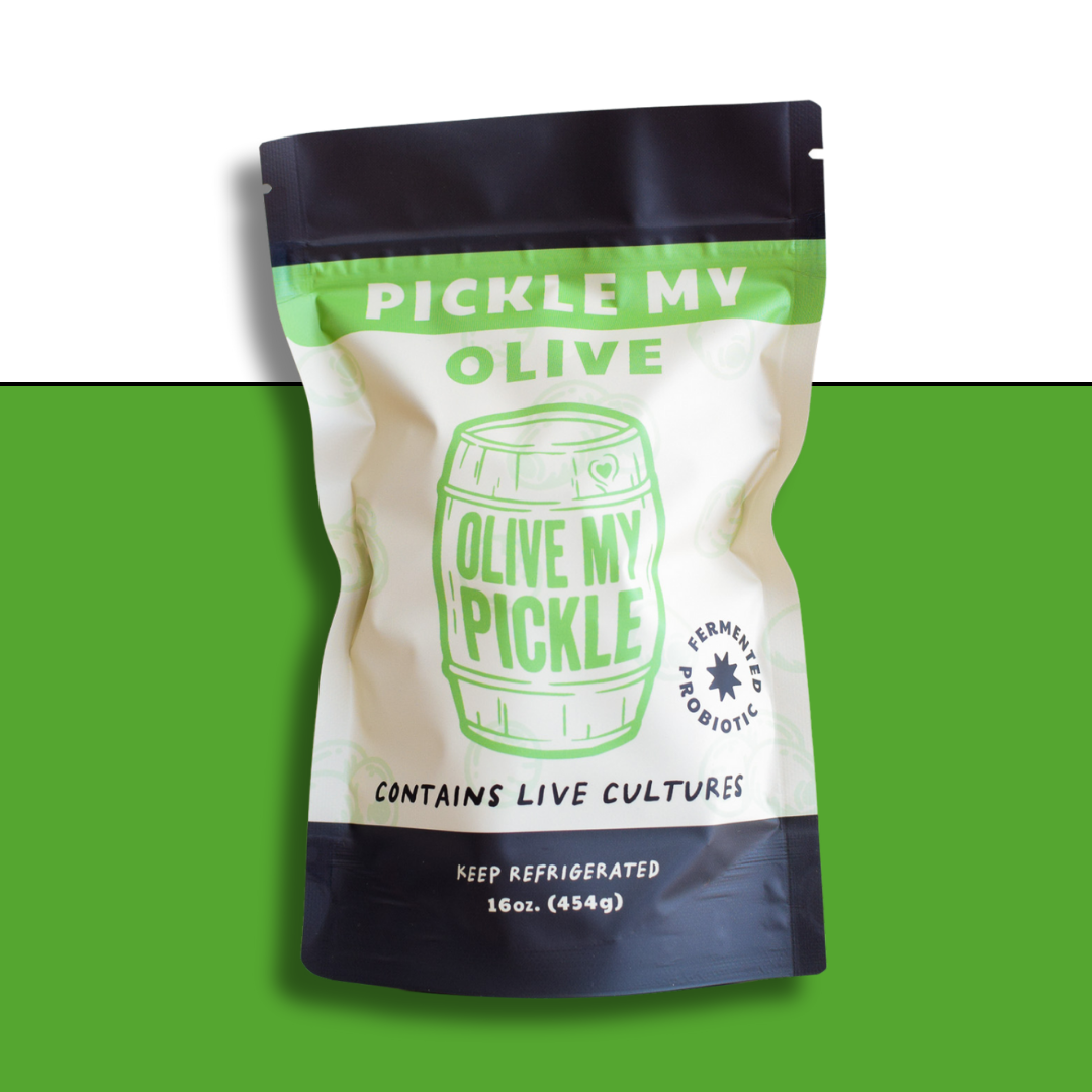 For years customers asked us for this: Pickle My Olive. Firm, queen olives brined in probiotic pickle juice. Each package contains a tiny kosher dill pickle for garnish.