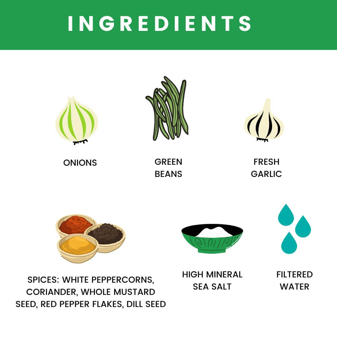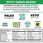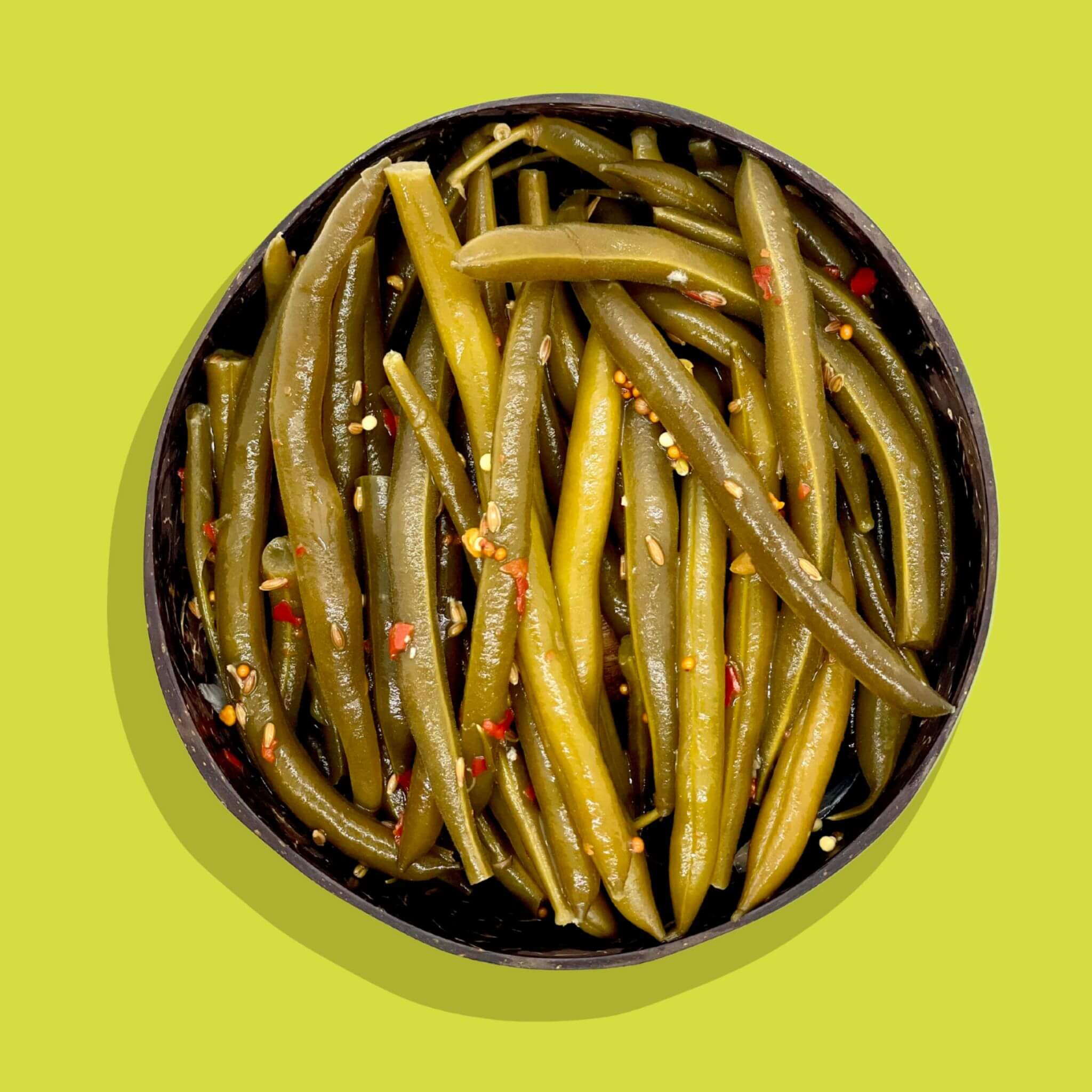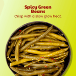 Crispy texture with a slow glow heat, fermented Spicy Green Beans finish with grassy notes. Mild heat.