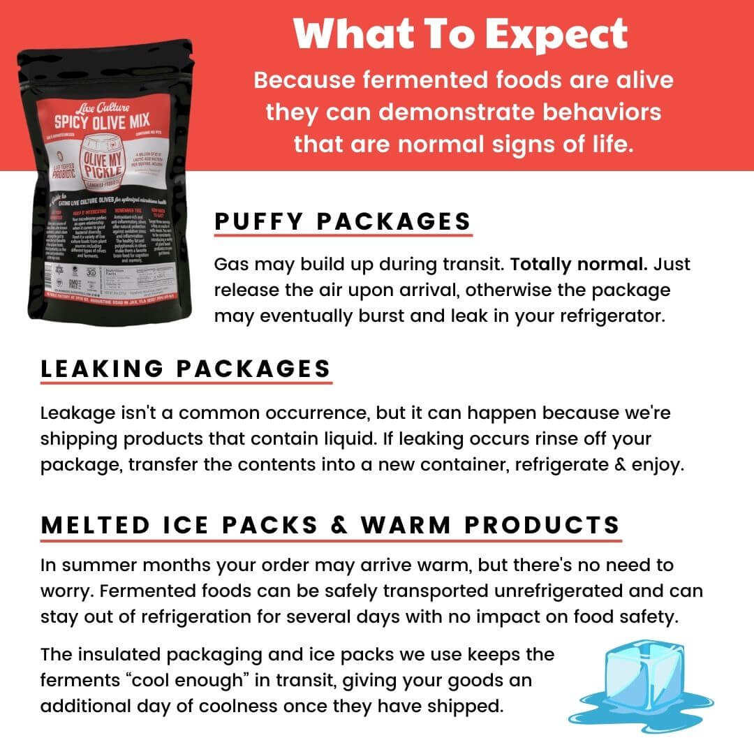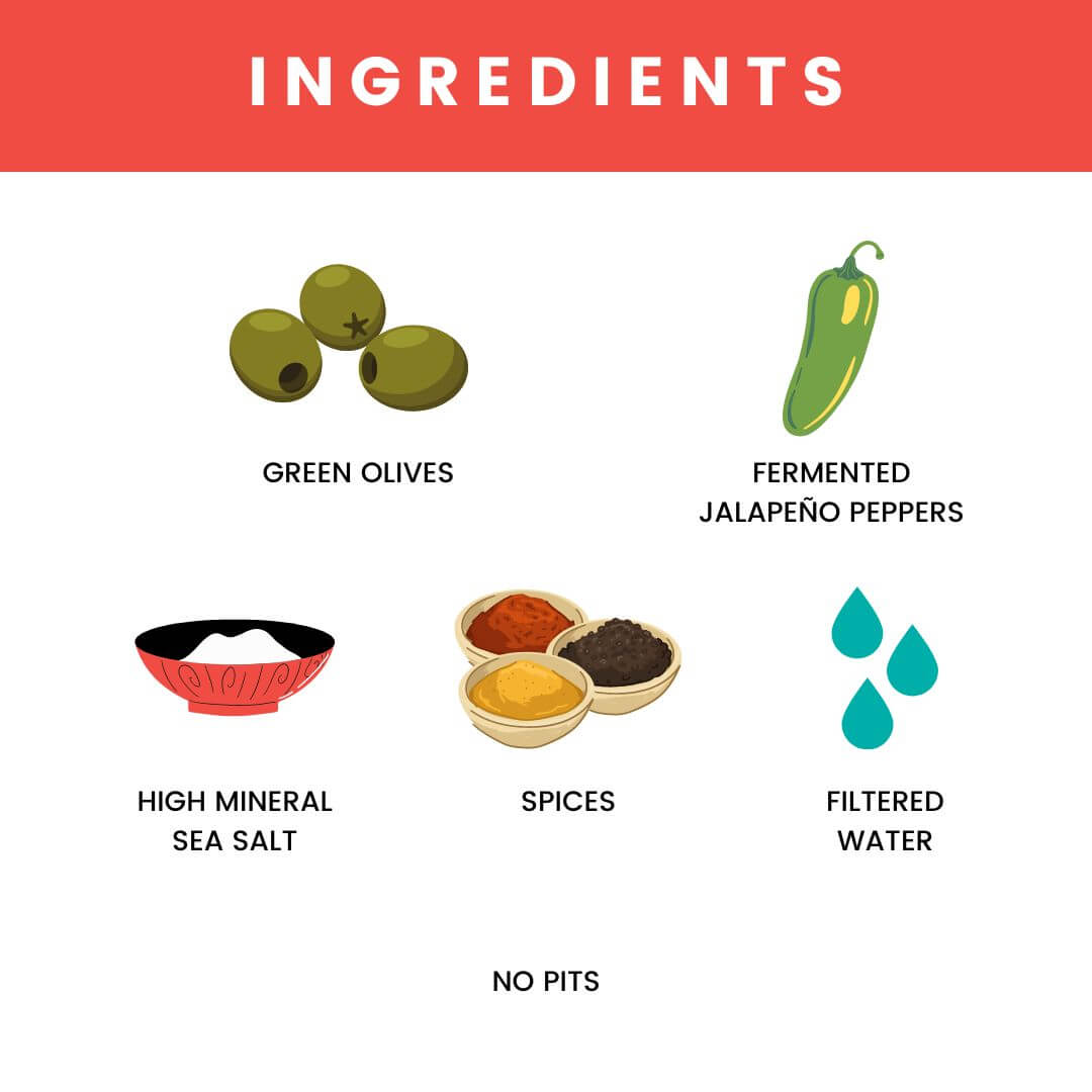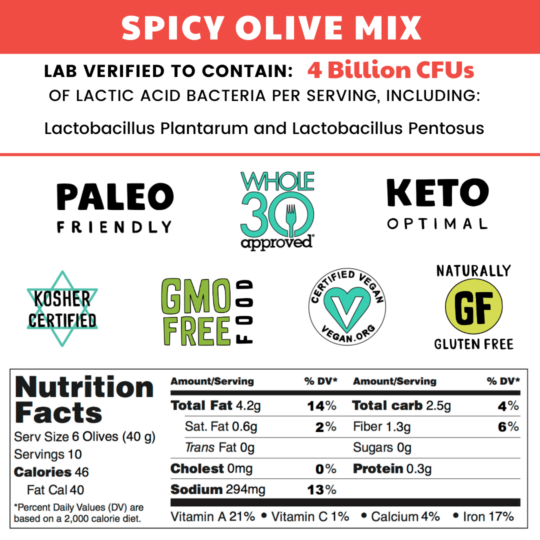 - One package contains 16 ounces, equaling one full pint of spicy mixed probiotic olives plus brine.