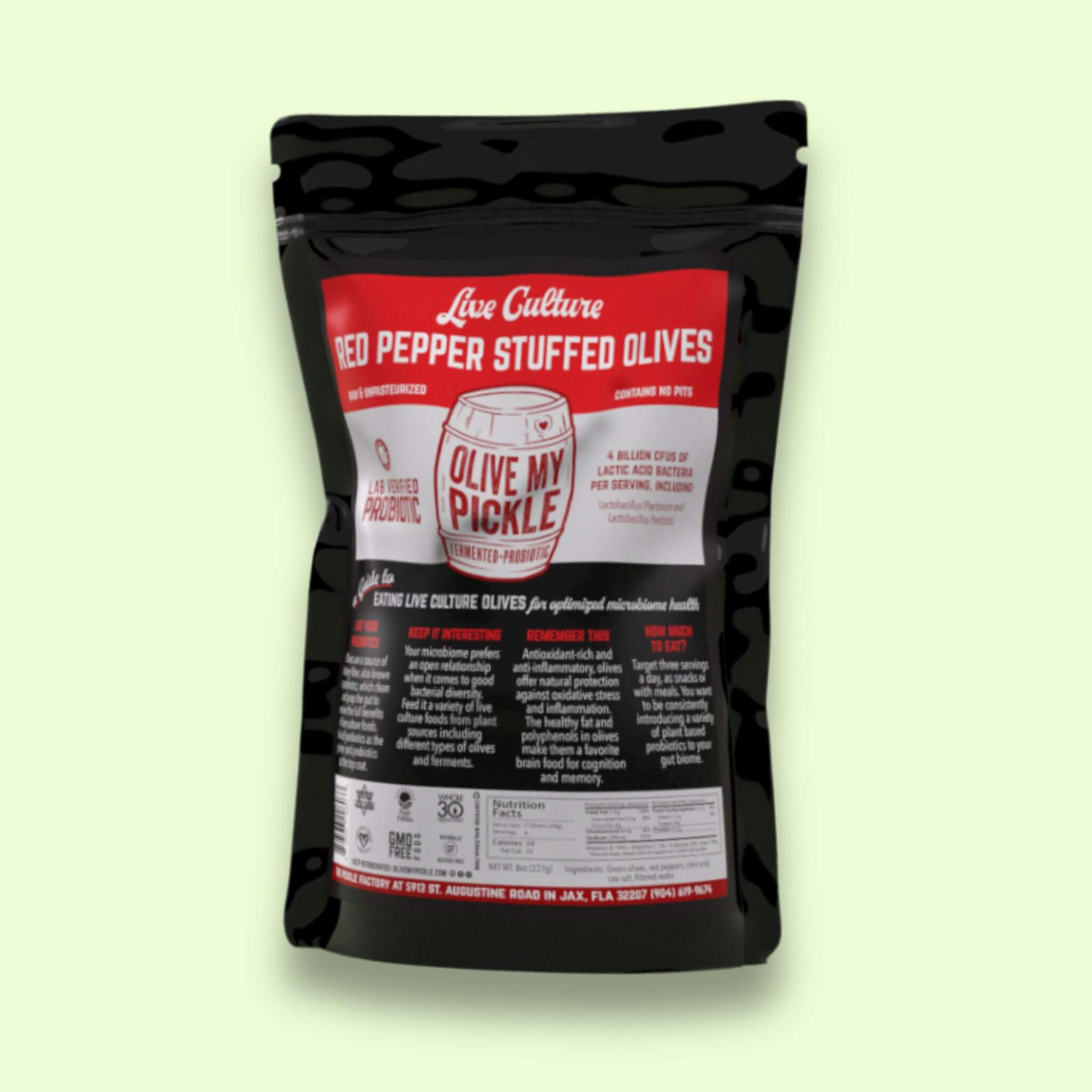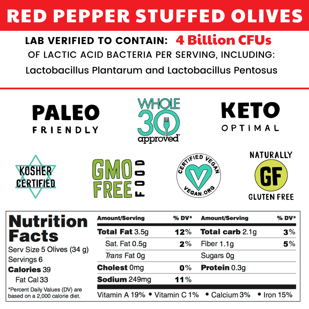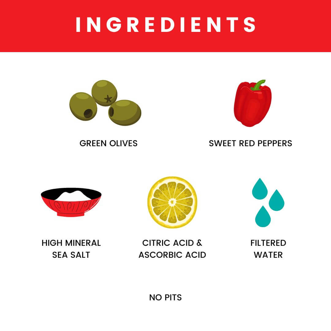 - Probiotic olives naturally fermented in salt water brine.