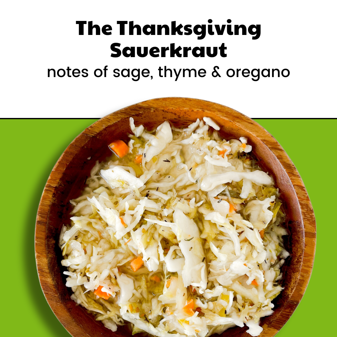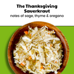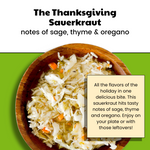 All the flavors of the holiday in one delicious bite. Thanksgiving Sauerkraut hits tasty notes of sage, thyme, and oregano. Enjoy on your plate or with those leftovers!