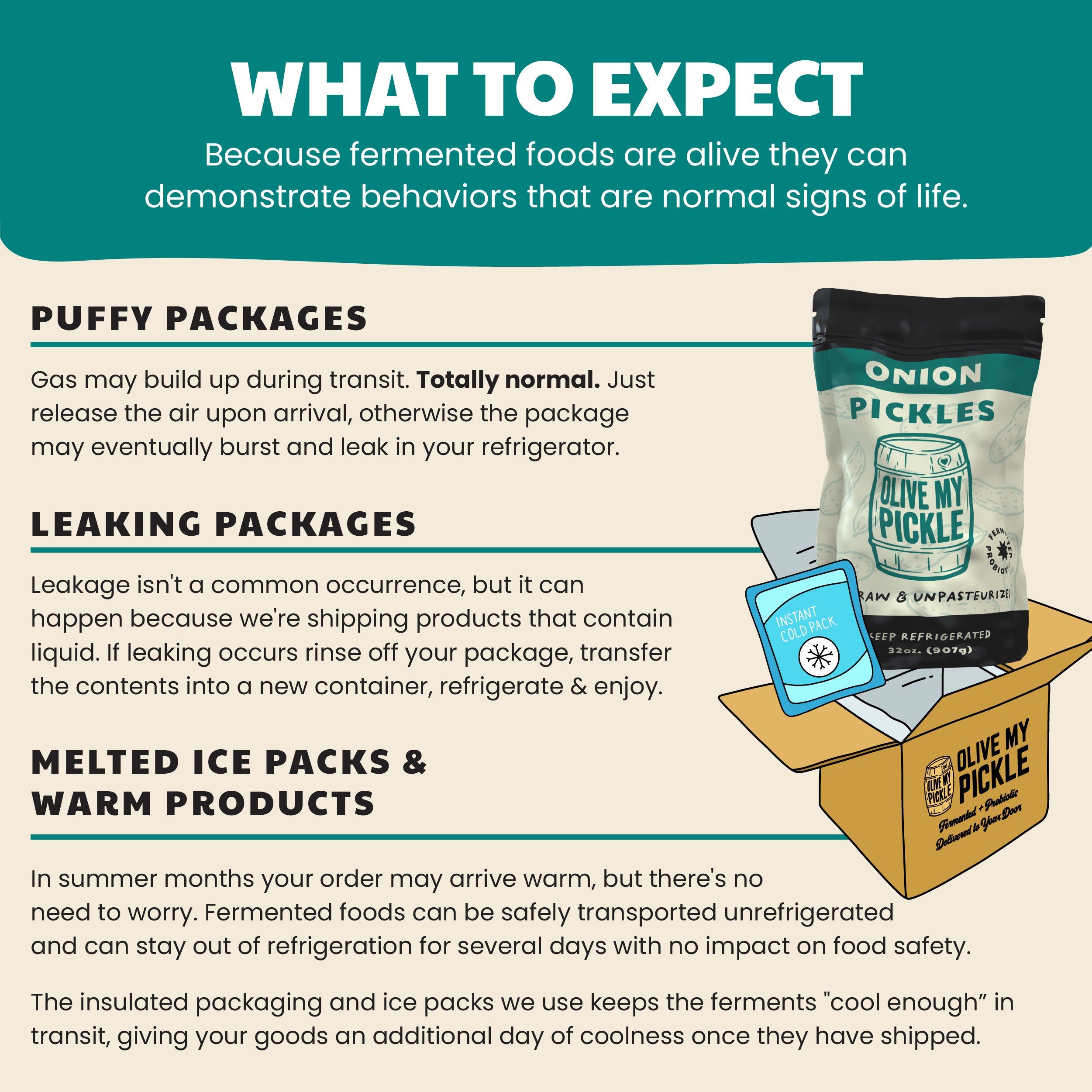 - Each 32 oz package contains over 1 pound of fermented pickles plus probiotic brine.