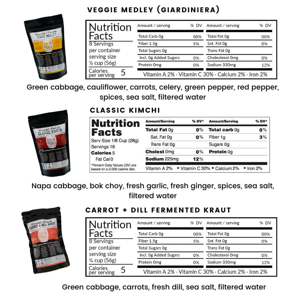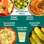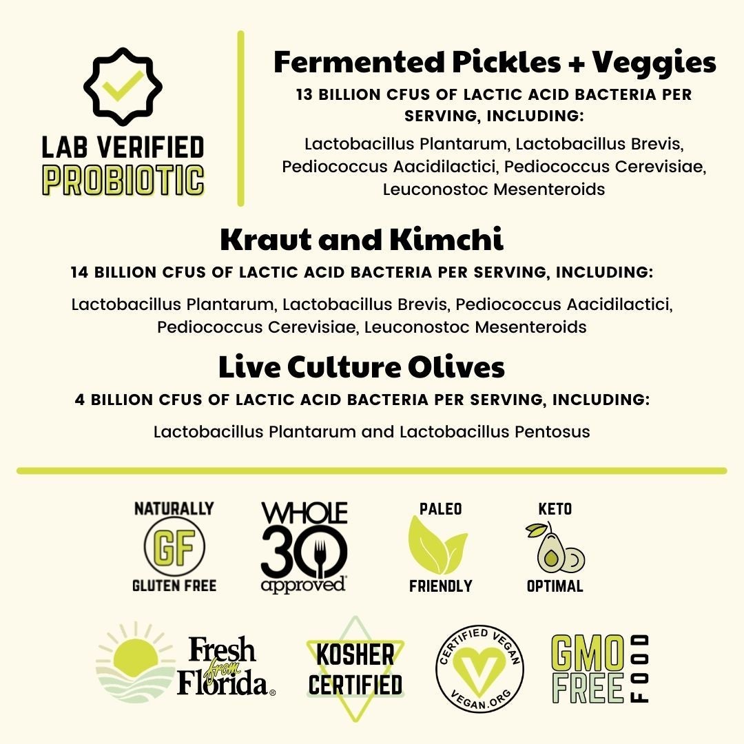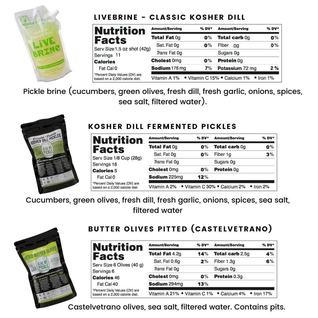 - The Ultimate Gut Health food bundle includes: (1) Kosher Dill Pickles, (1) Pitted Butter Olives, (1) Kosher Dill LiveBrine, (1) Fermented Veggies, (1) Carrot + Dill Sauerkraut, (1) Classic Kimchi